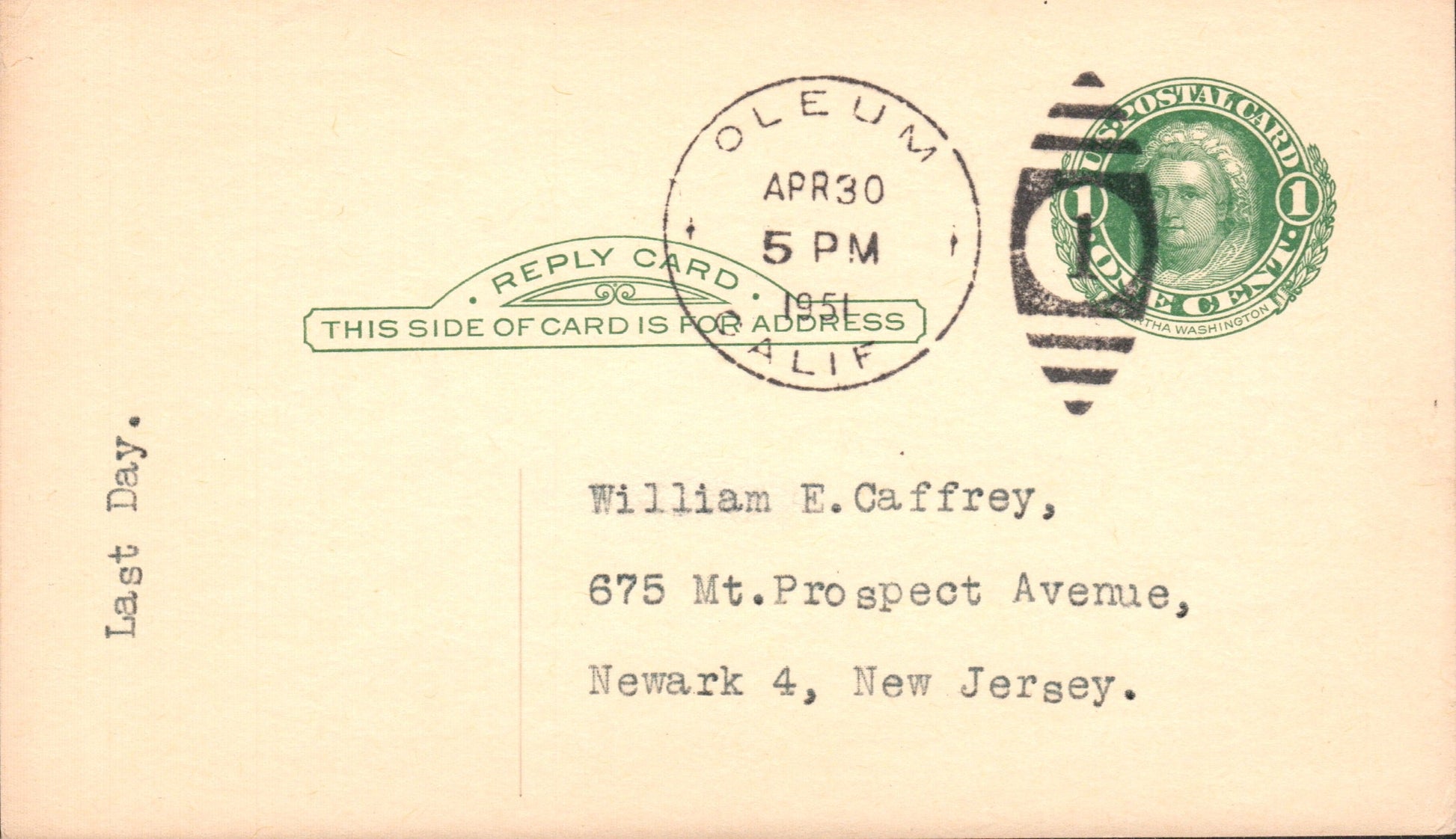 Oleum (1910-1951) 1951 duplex on LD Postal Card