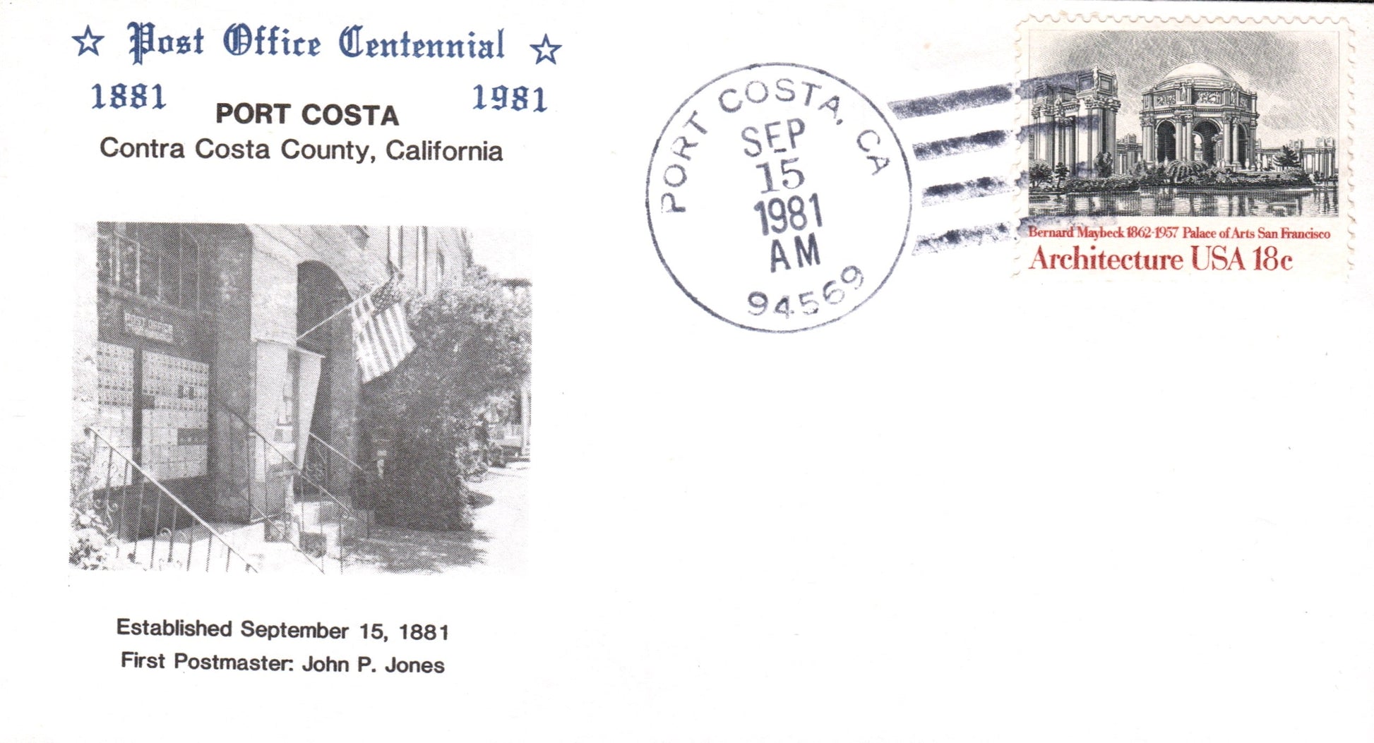 Port Costa 1981 machine cancel on cacheted cover, 100th year of post office