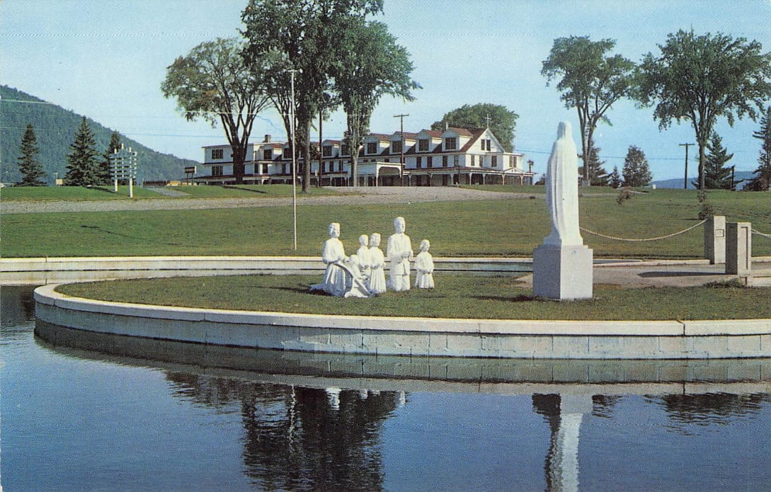 Post cards: Overview [chrome]; Covered bridge & town view [linen]; Lady of Grace shrine [chrome]; Beaver Brook Falls [linen]