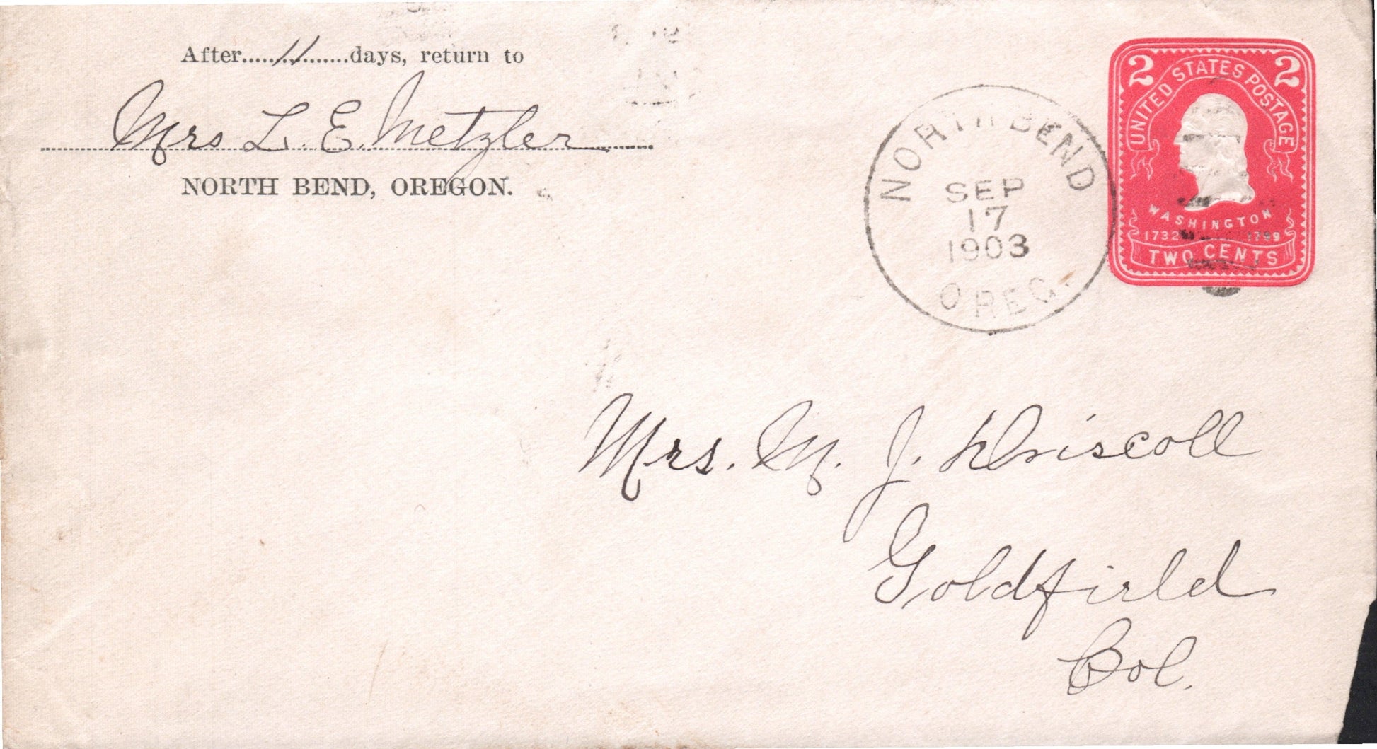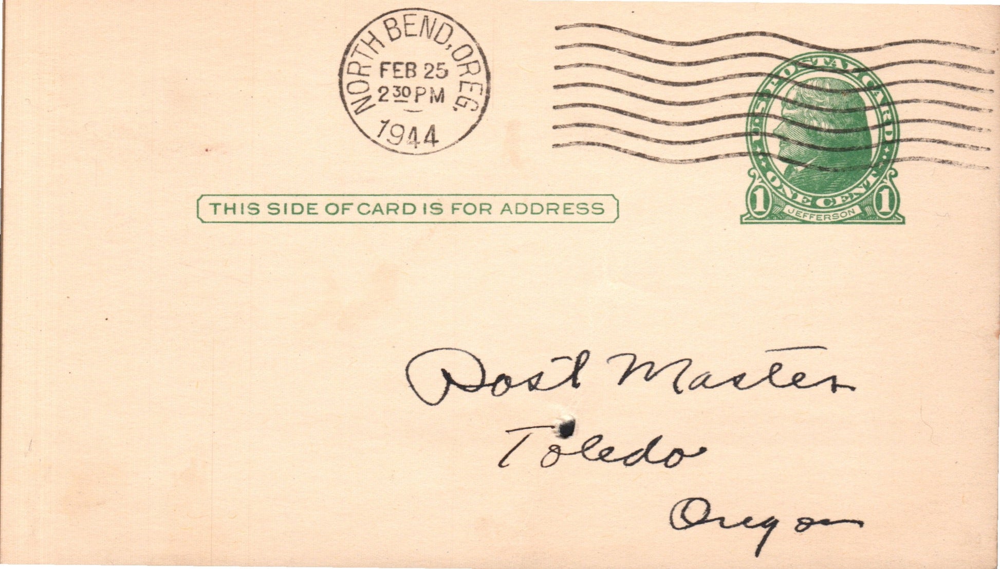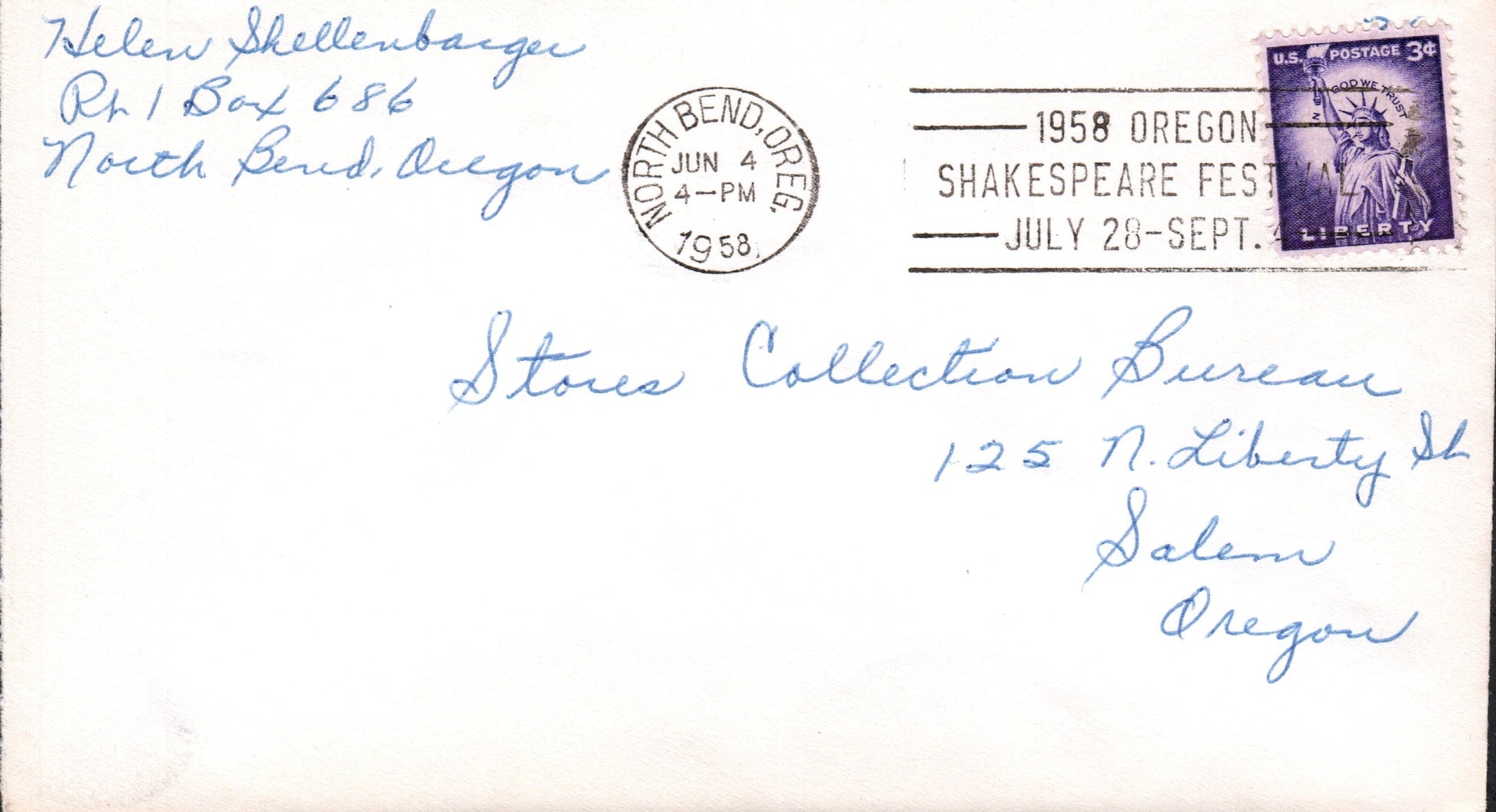 North Bend 1903 duplex on cover; 1944 machine cancel on Postal Card; 1958 machine slogan “1958 Oregon Shakespeare Festival” slogan on cover; 1982 machine cancel on cover