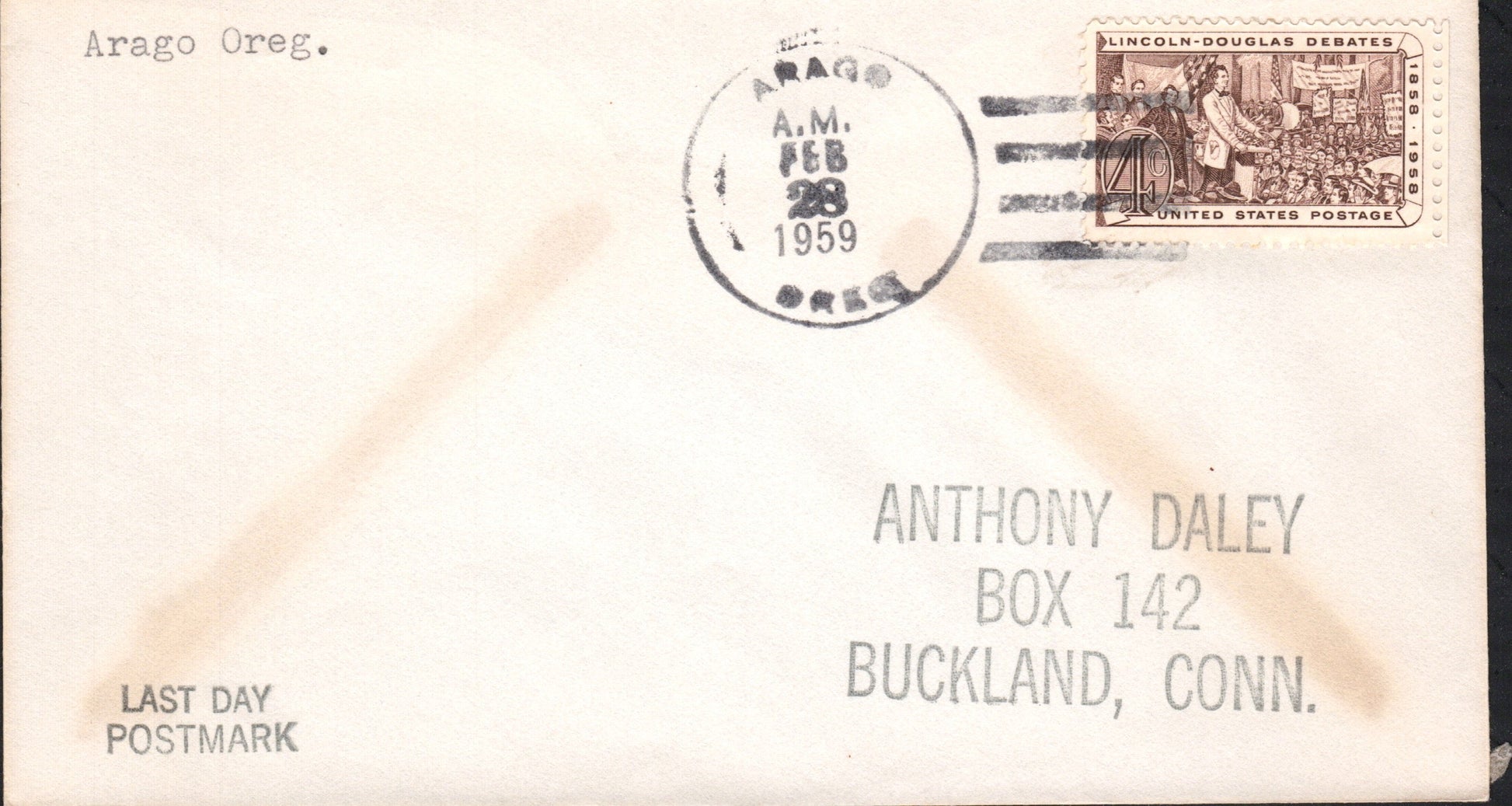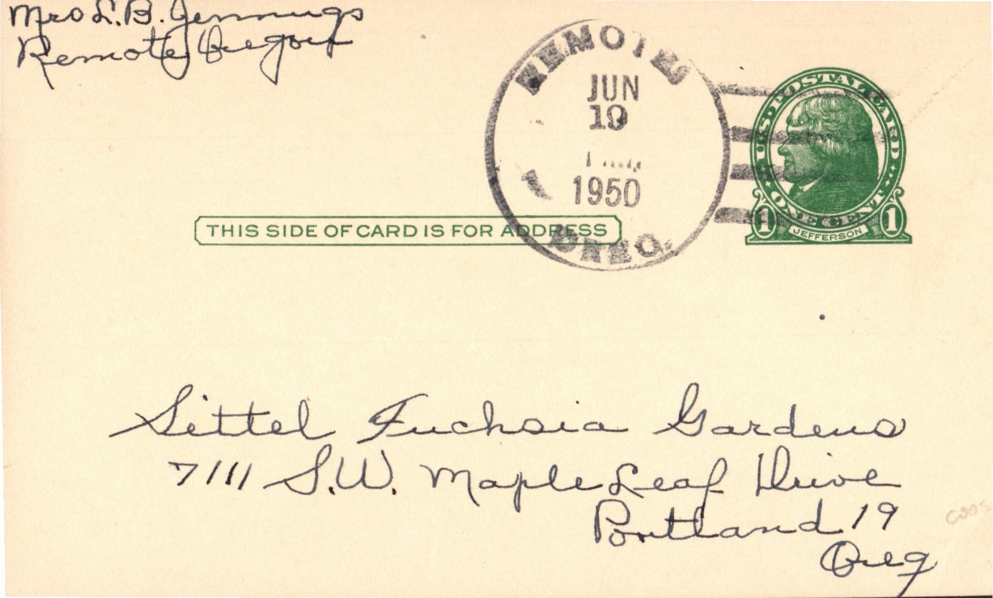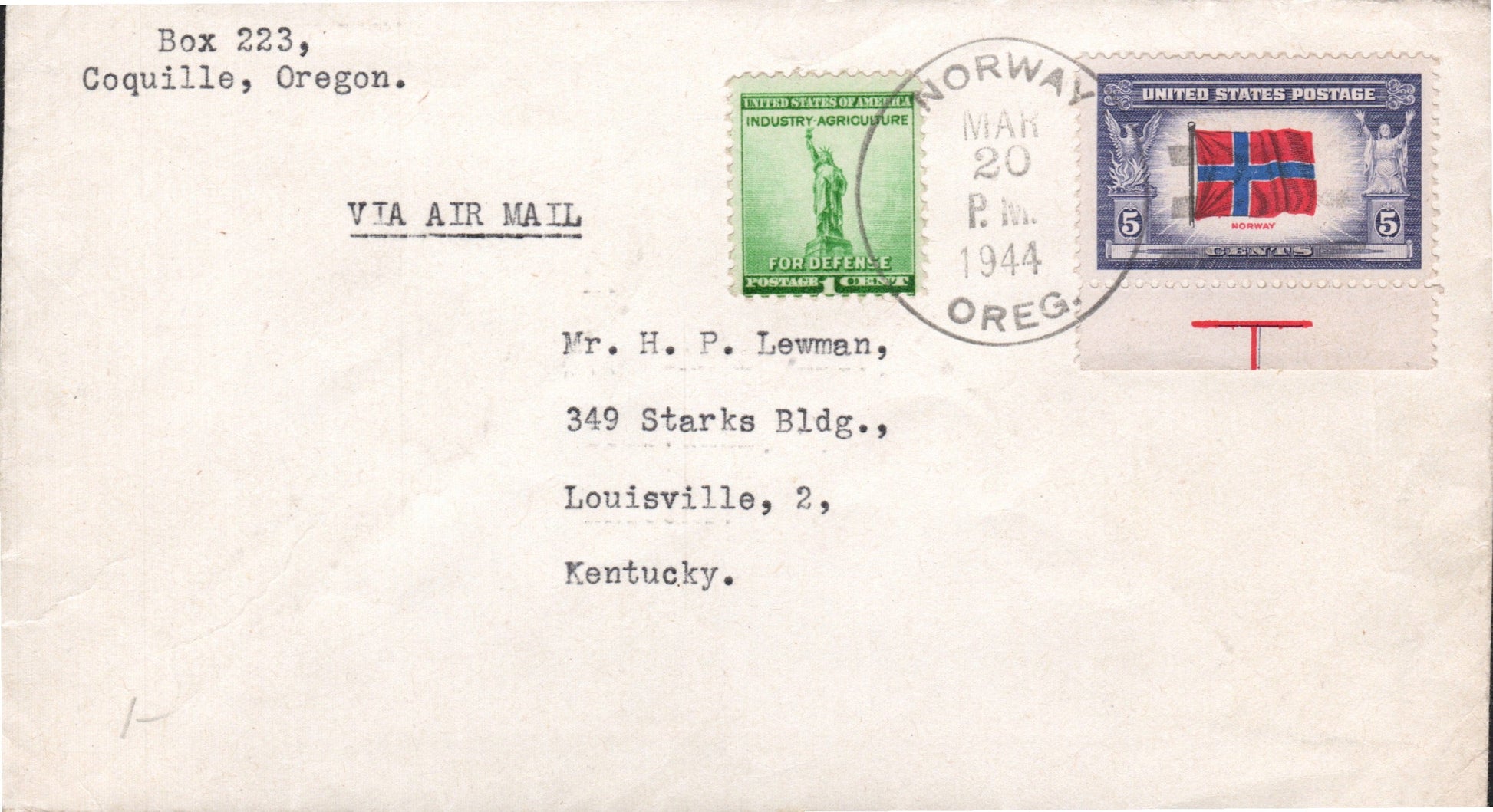 North Bend 1903 duplex on cover; 1944 machine cancel on Postal Card; 1958 machine slogan “1958 Oregon Shakespeare Festival” slogan on cover; 1982 machine cancel on cover