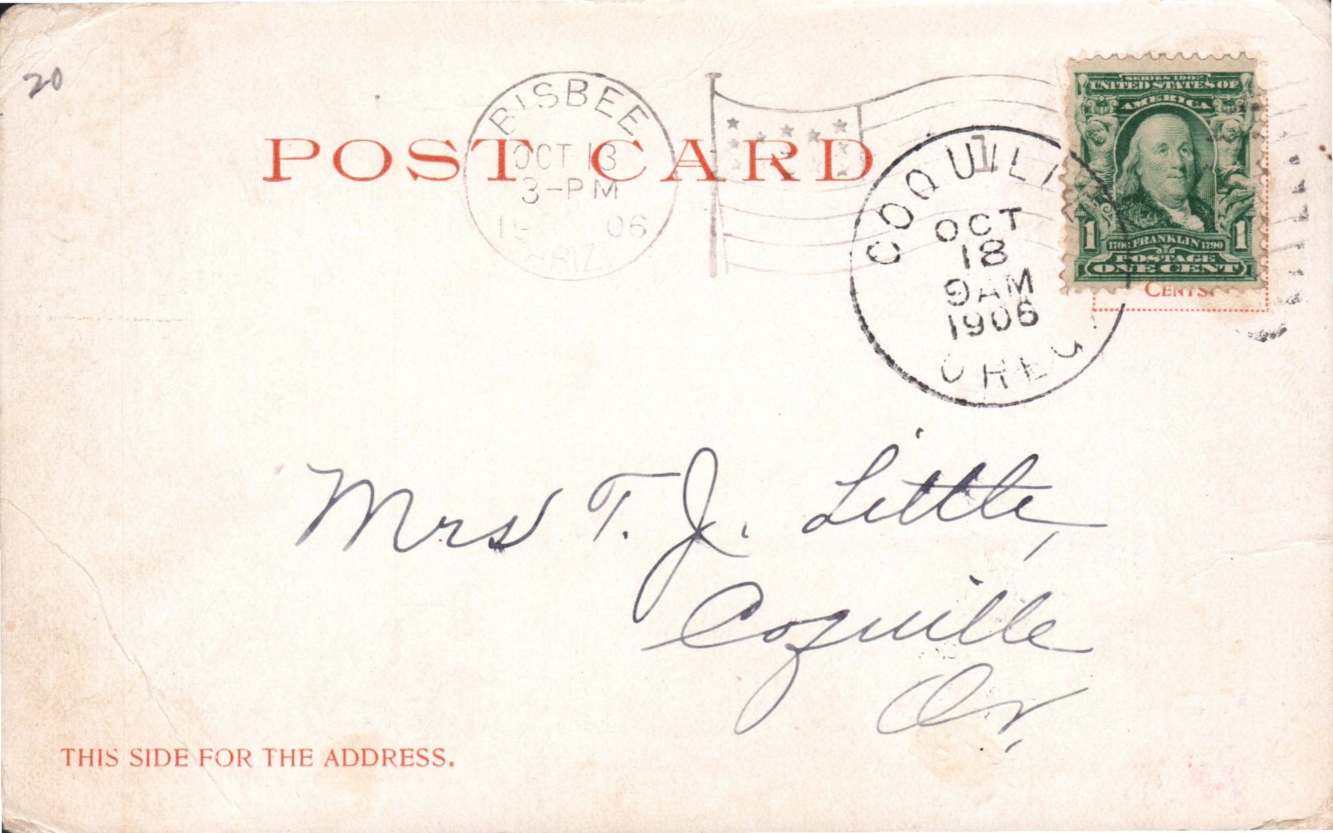 Lampa (1905-1918) 1908 Doane 1 as Rec’d mark struck over Quincy, Ill. (Flag cancel) and Coquille transit mark on post card mis-addressed to “Nampa, Ore.”; 1910 Doane on post card, corner damage