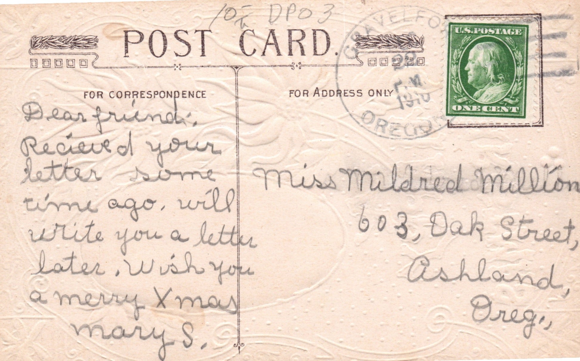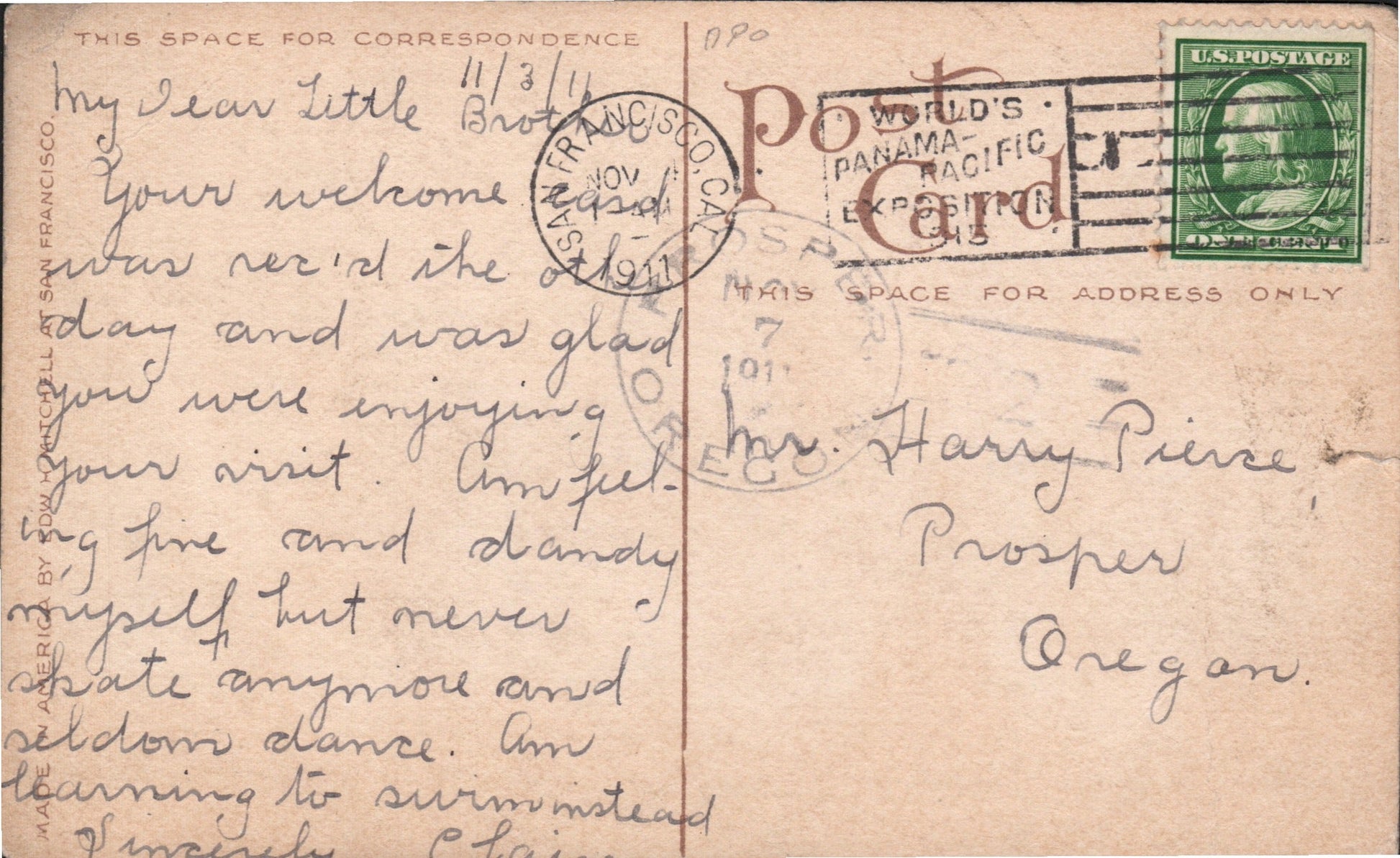 Prosper (1893-1929) light 1911 Doane as rec’g mark on post card from S.F.