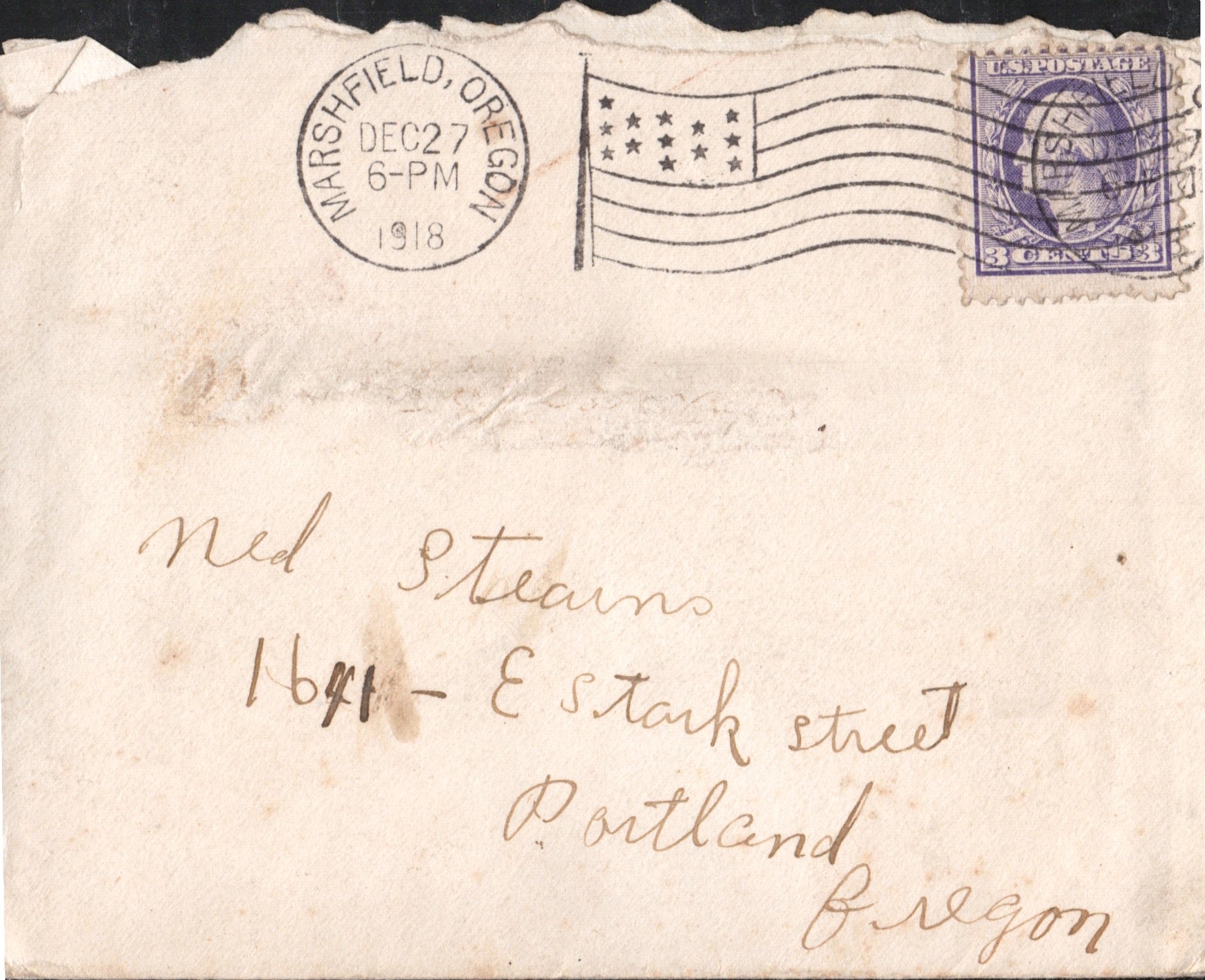 Marshfield (1871-1945) 1904 duplex on cover, “Sunset Lodge I.O.O.F.” corner; 1918 Flag cancel on cover, bit ragged at top; 1940 machine cancel on cover with two 1 1/2 ct. stamps
