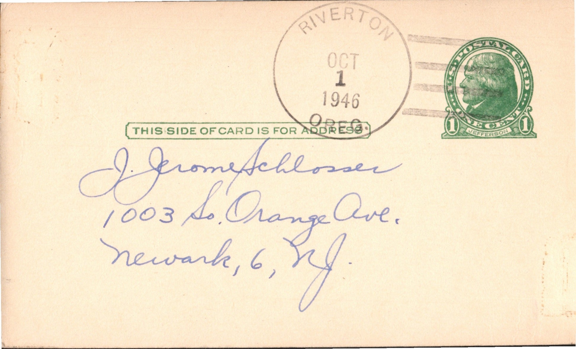 Riverton (1890/1961) 1946 4-bar on Postal Card