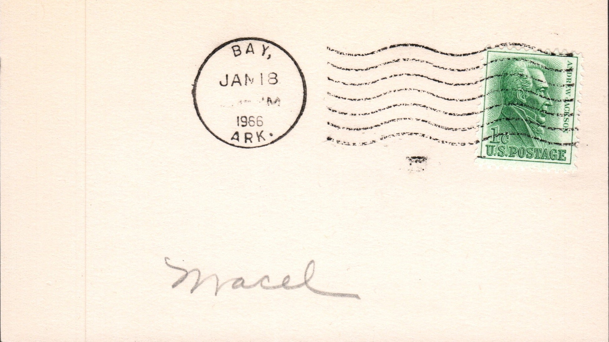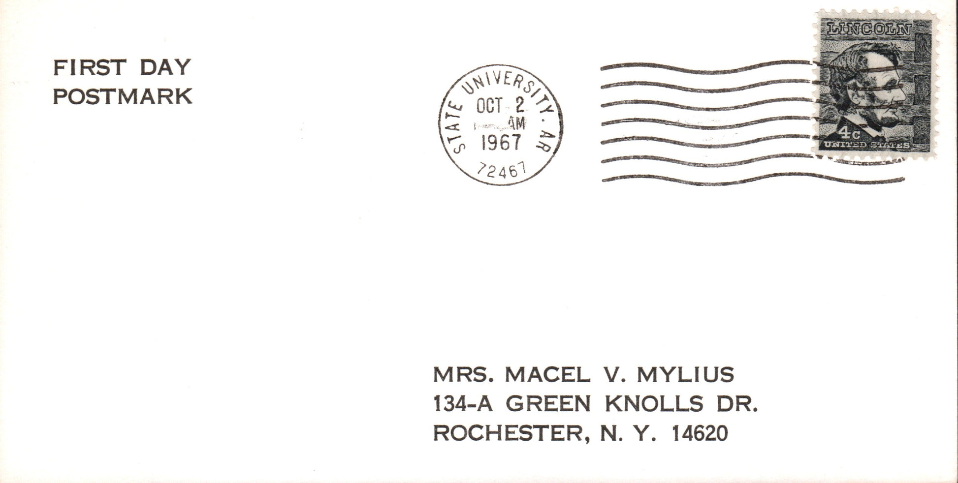 State University 1967 machine cancel on FD (of postal status) cover-sized card, PM autograph on back
