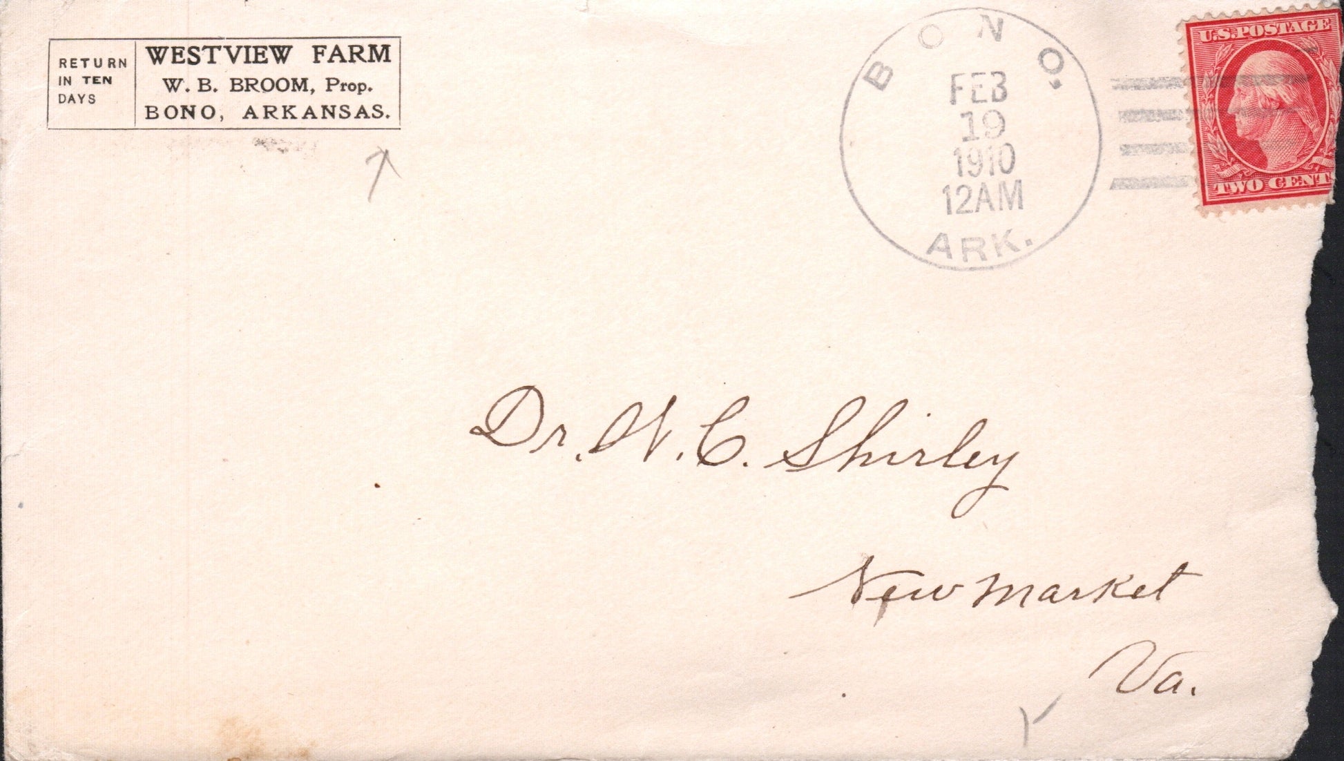 Bono 1910 4-bar on cover, “Westview Farm, W.B. Broom, Prop., Bono” corner