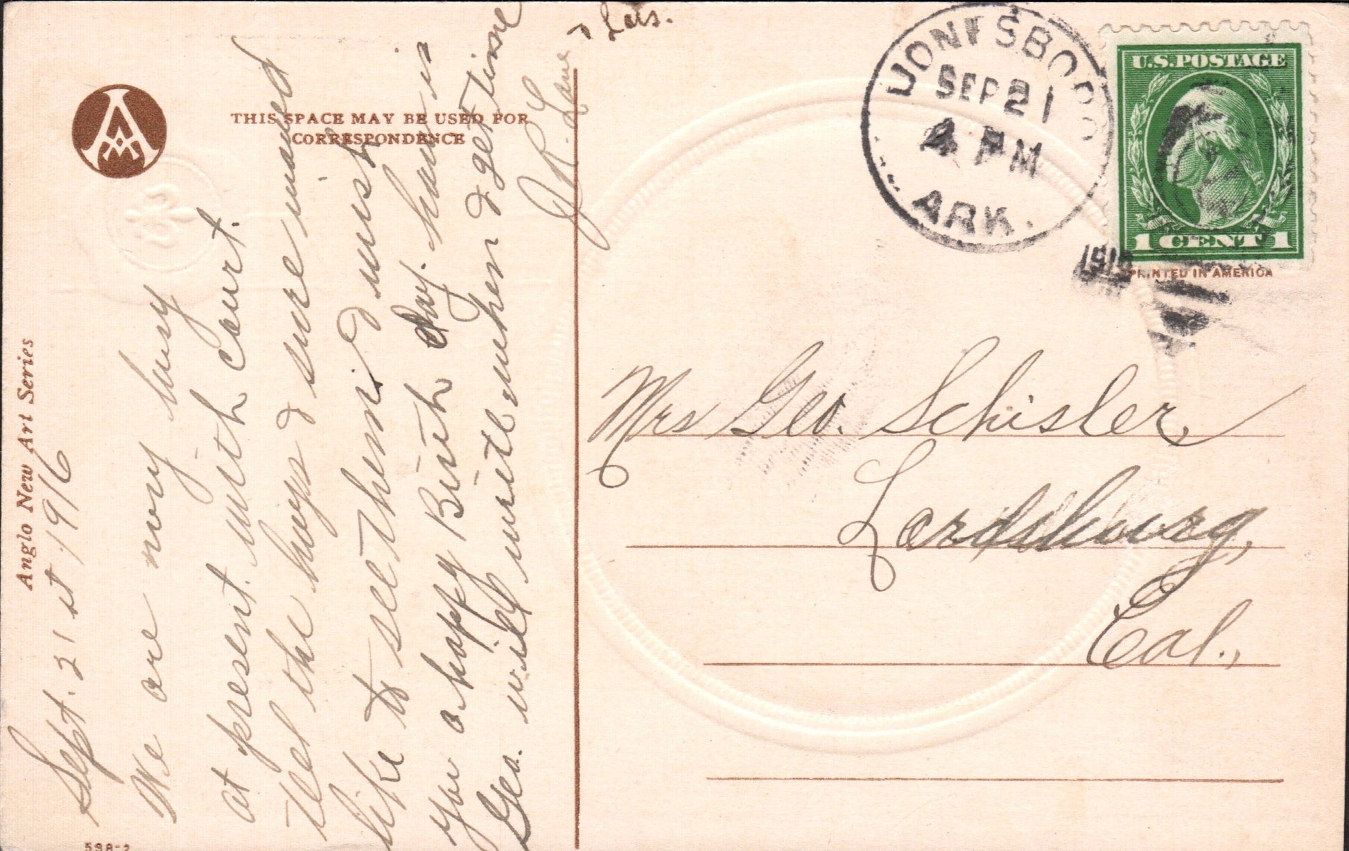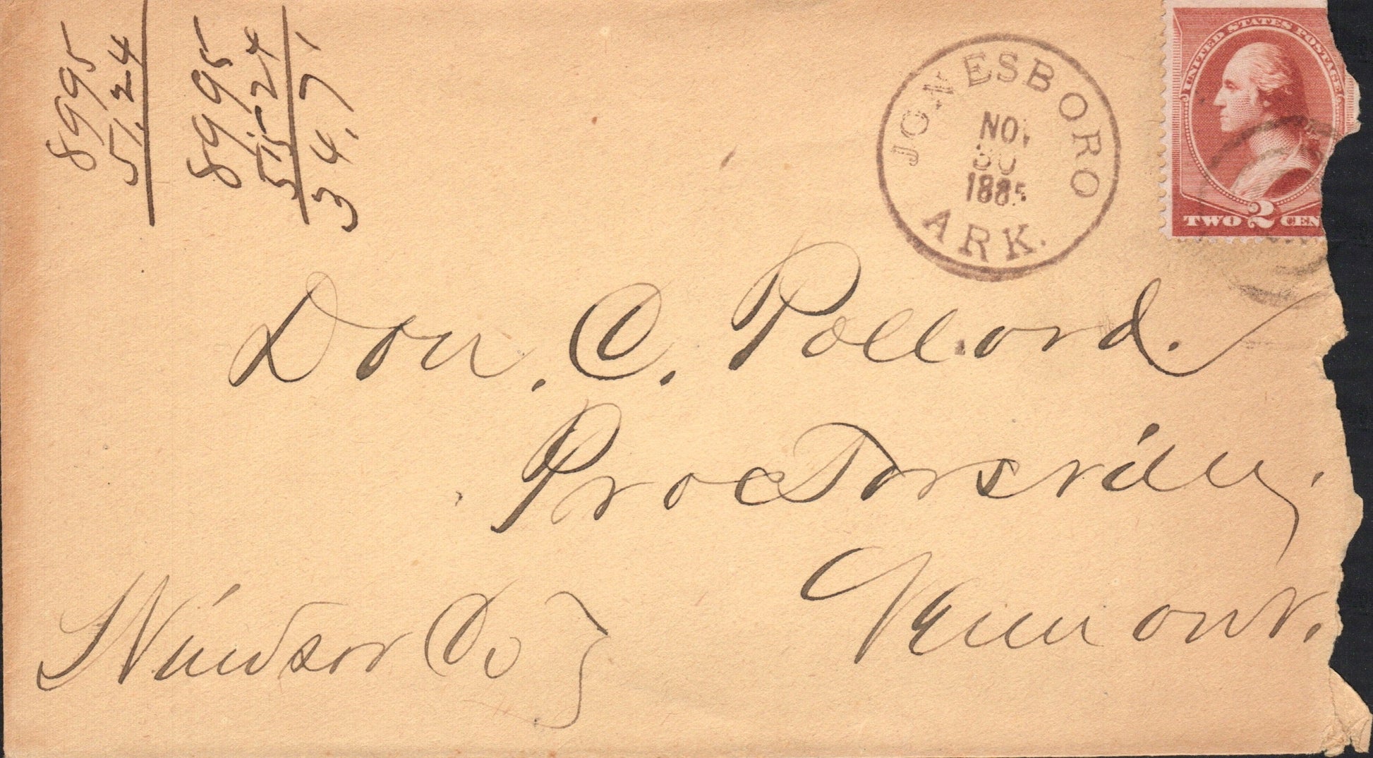 Jonesboro 1885 cds & target killer on cover, opened ragged rt. into stamp; 1916 duplex on post card; 1919 Flag cancel on cover, “Sloan & Sloan” corner; 1954 machine cancel on cacheted cover “U.S. Air Mail First Flight Jonesboro”.