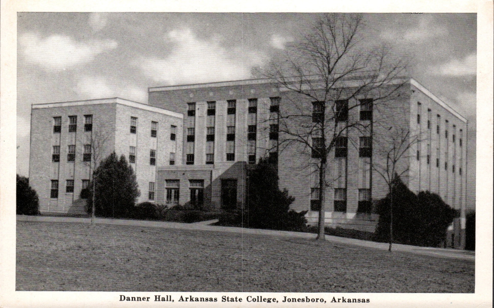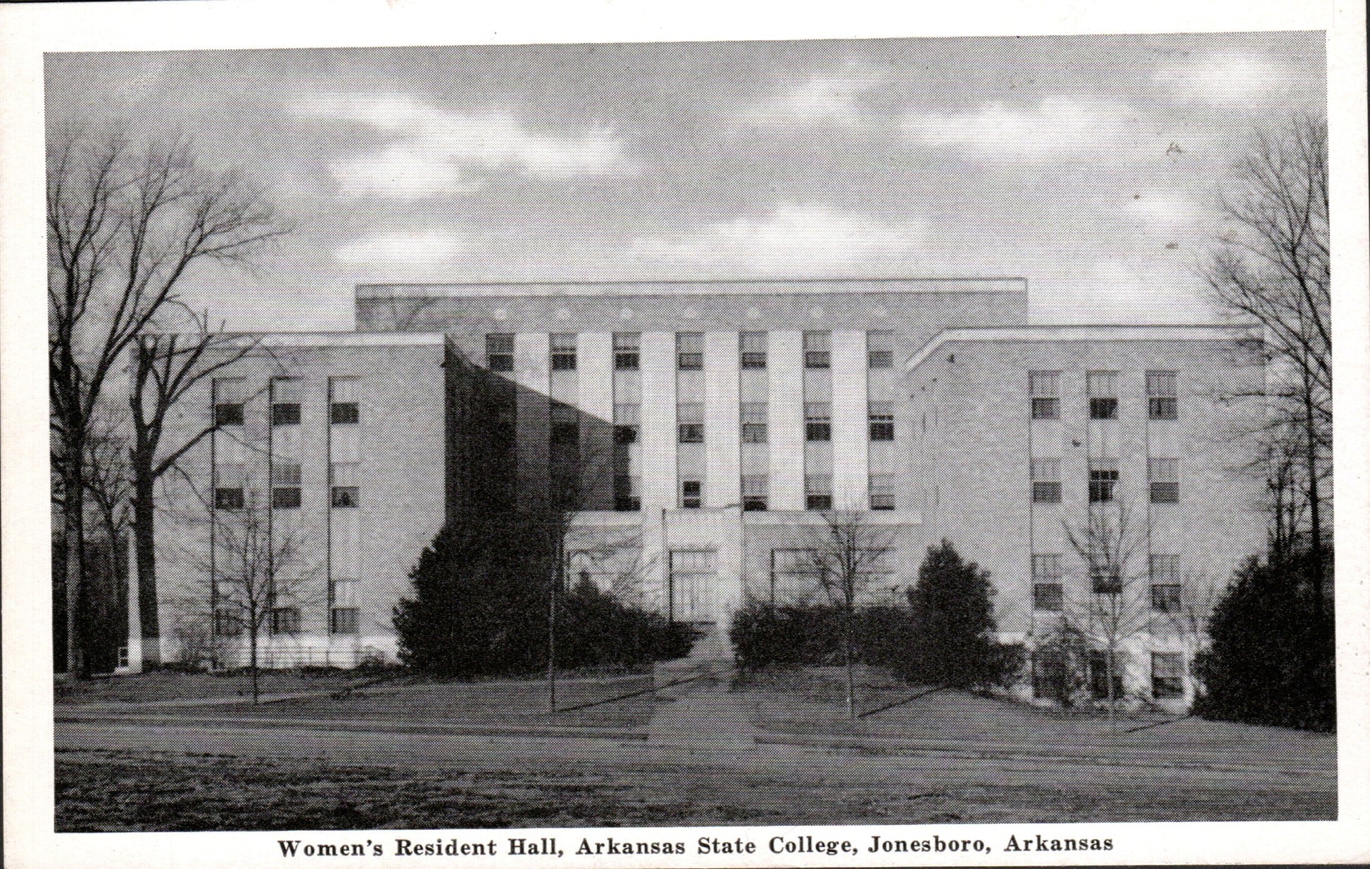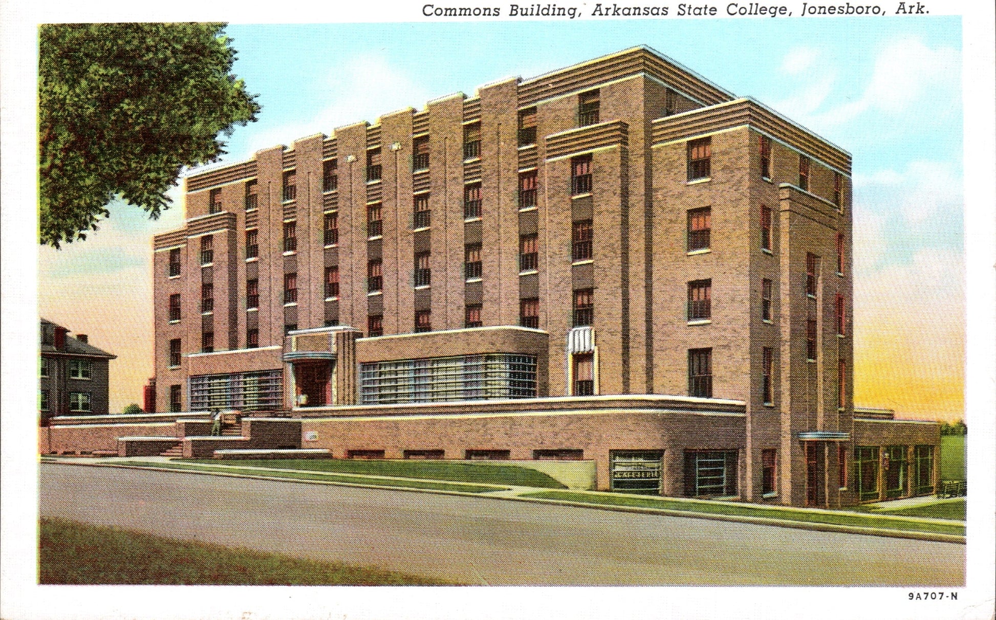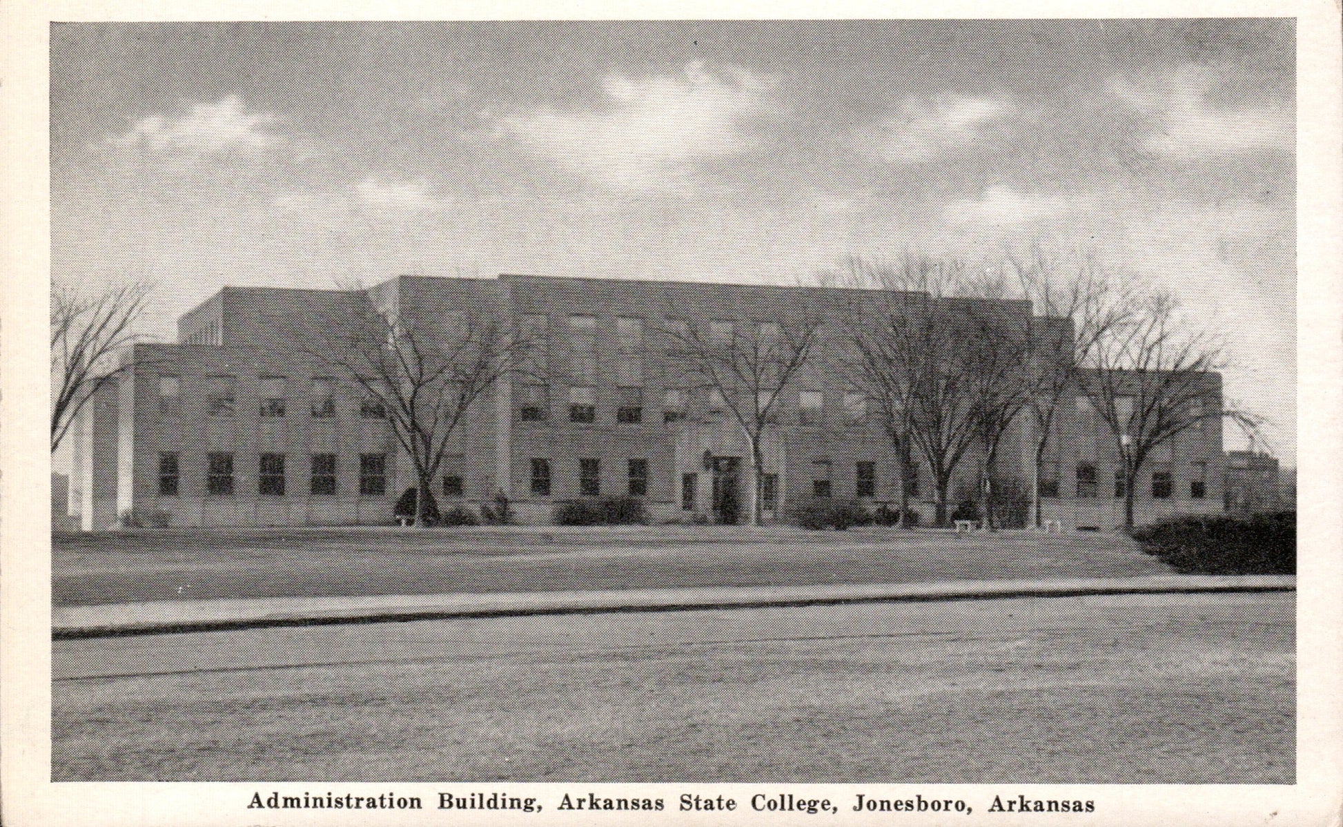 Arkansas State College views: Administration [B&W], Commons Building [linen], Science Building, Armory [B&W], Training School [2 linen views], Women’s Residence Hall [B&W], Danner Hall [B&W], Lewis Hall [B&W]