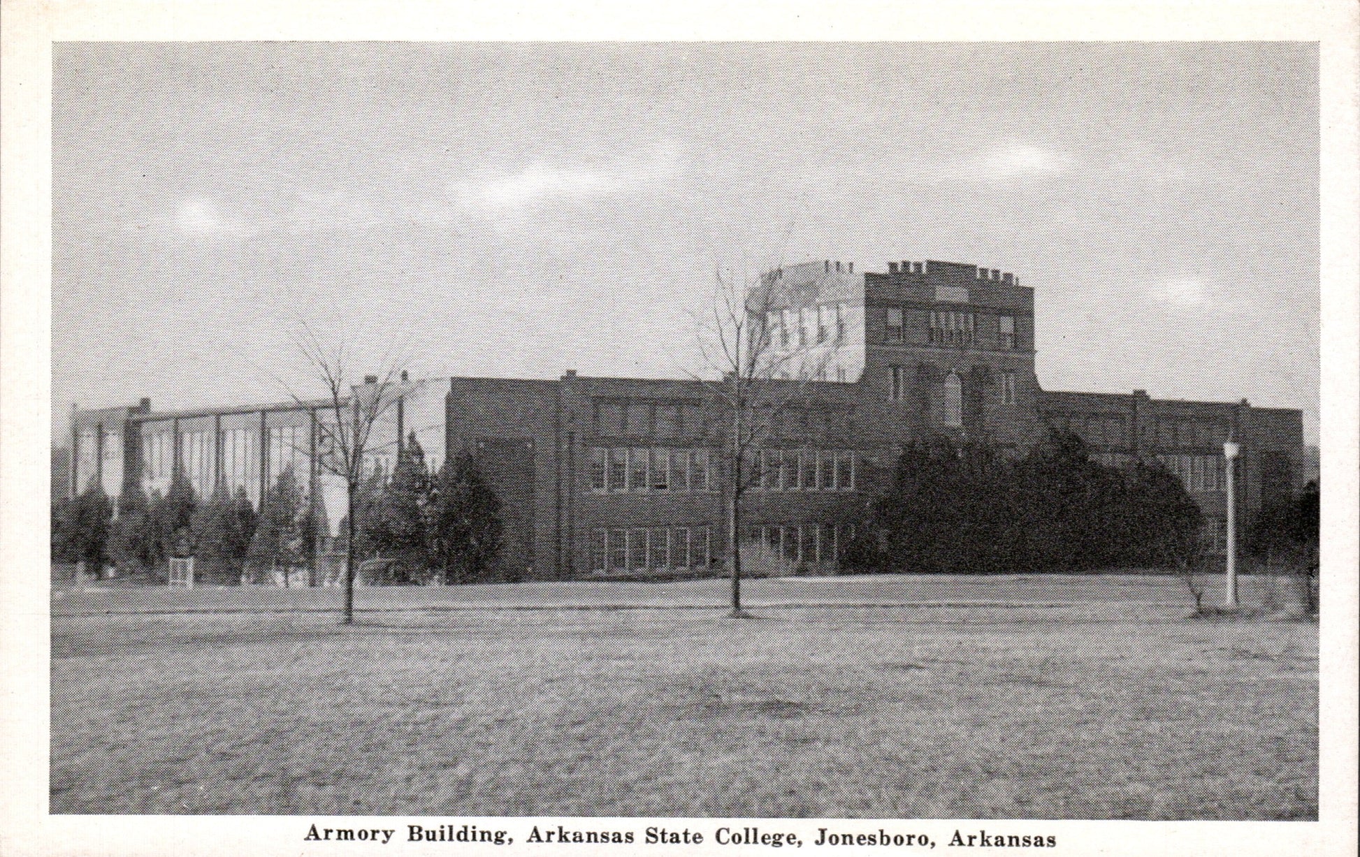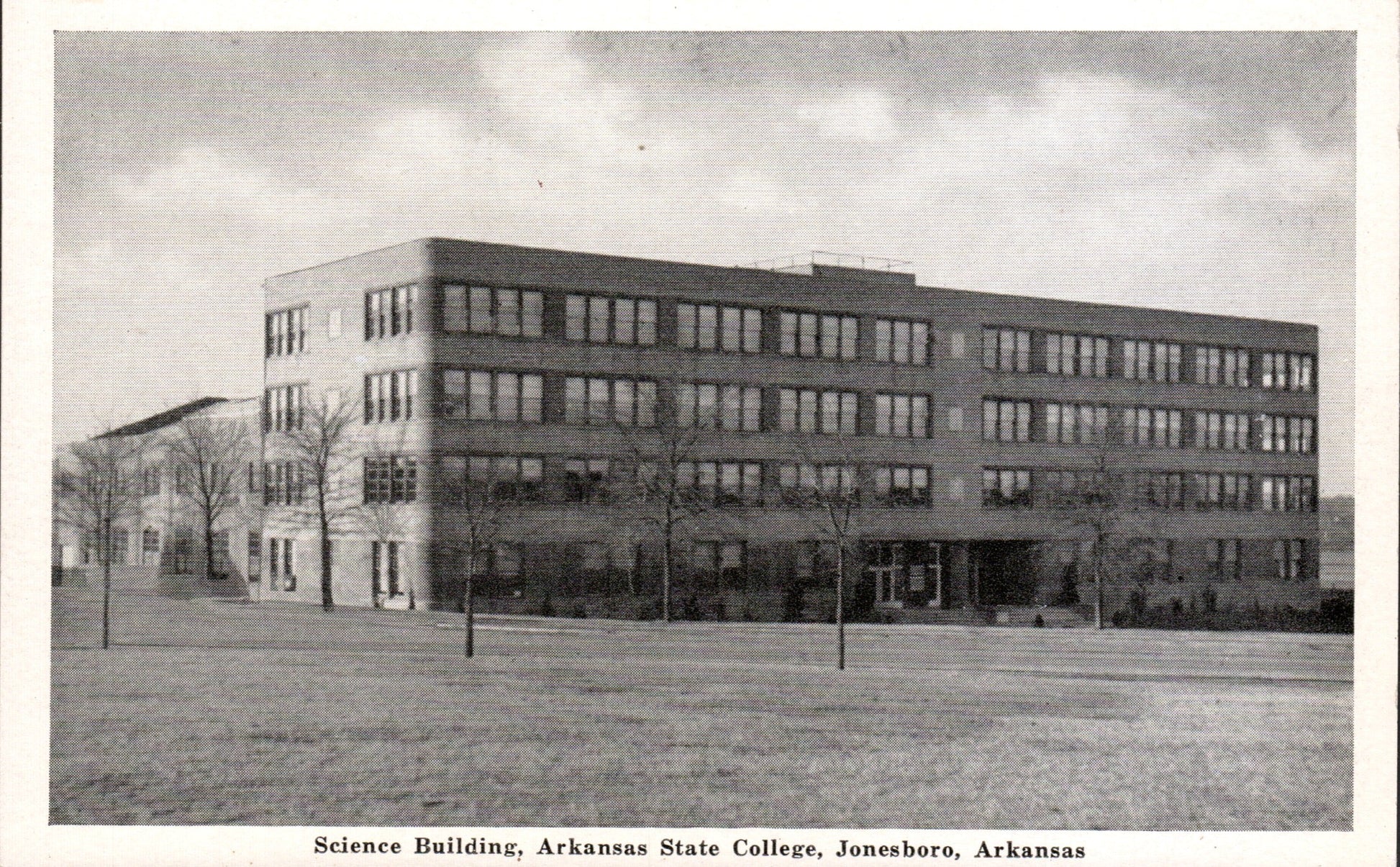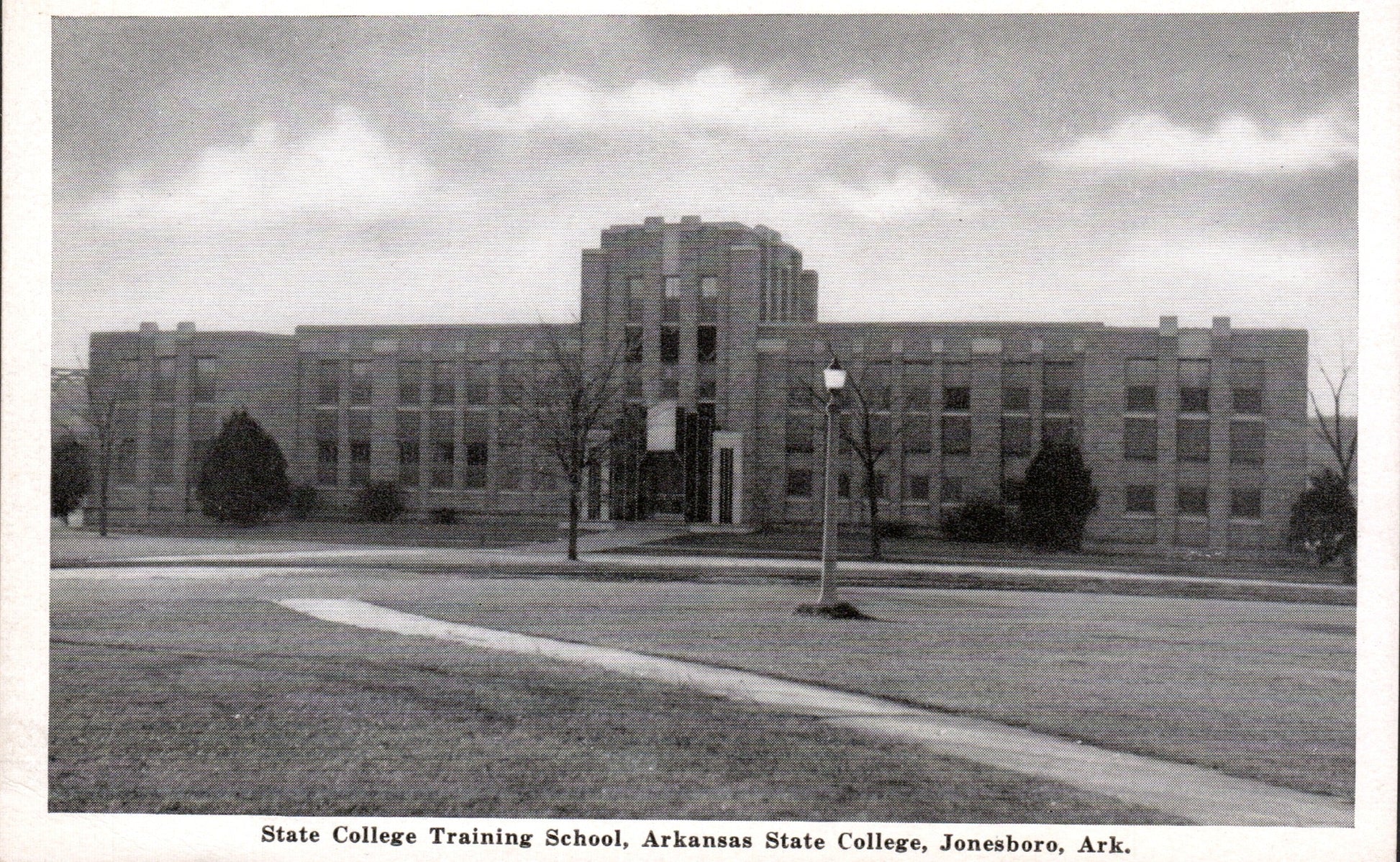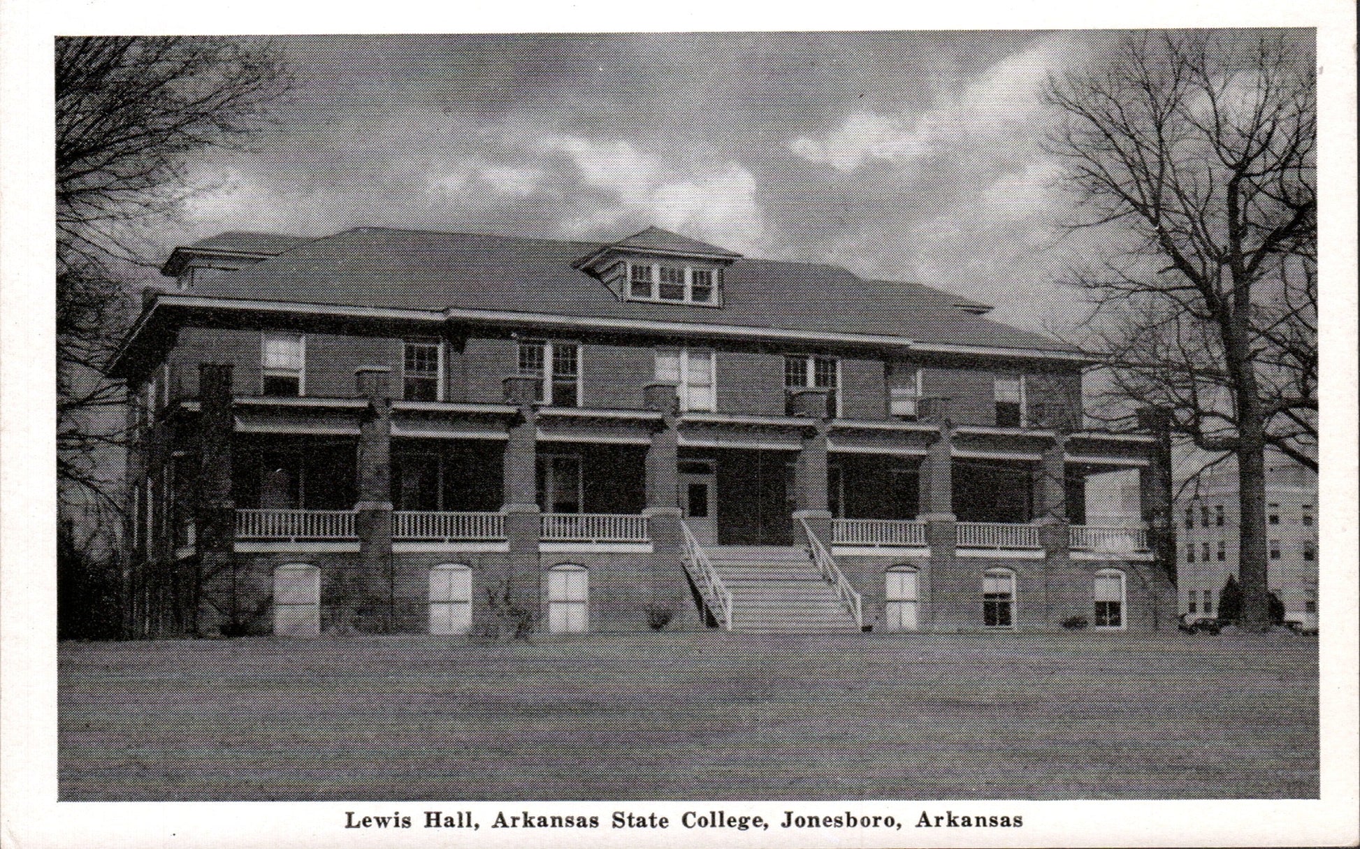 Arkansas State College views: Administration [B&W], Commons Building [linen], Science Building, Armory [B&W], Training School [2 linen views], Women’s Residence Hall [B&W], Danner Hall [B&W], Lewis Hall [B&W]