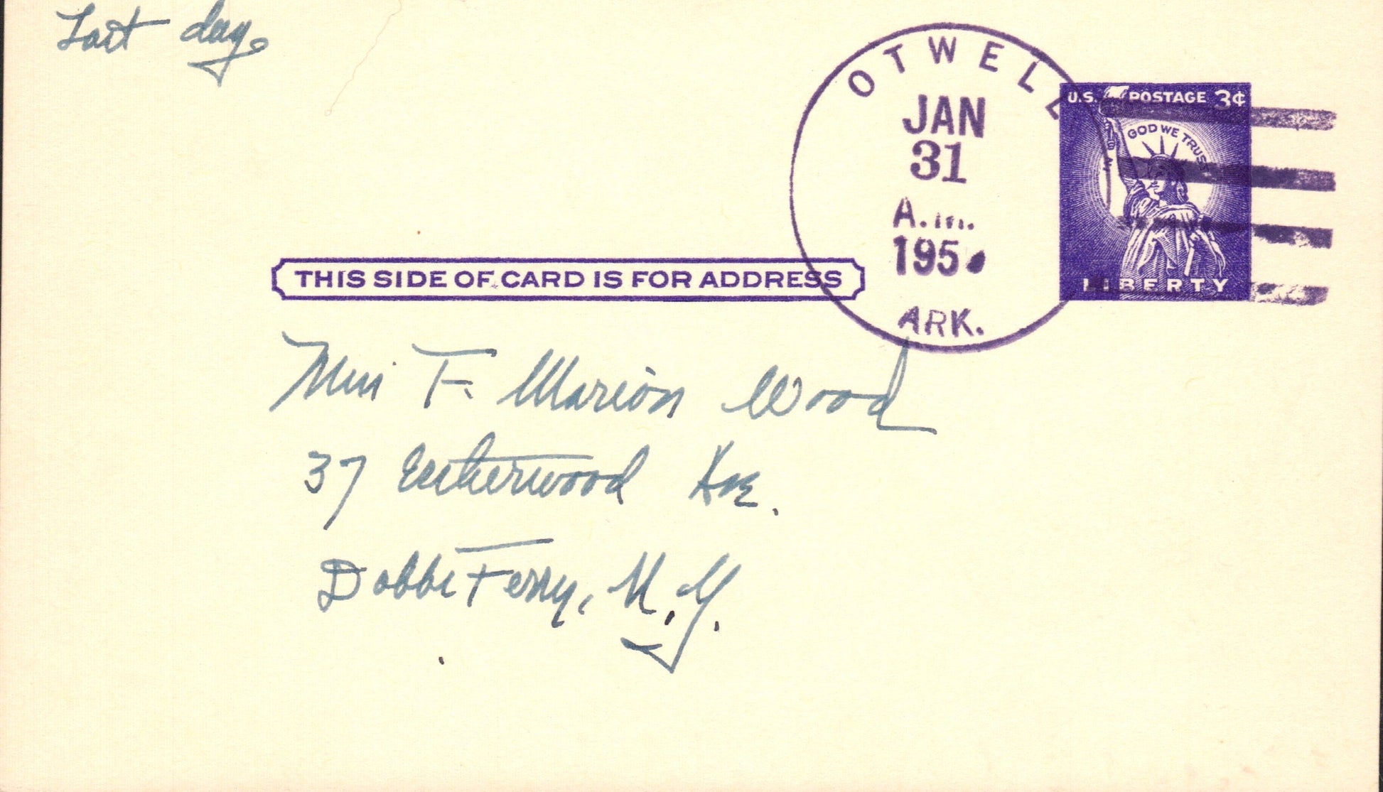 Otwell (1915-1959) 1959 4-bar on LD cover-sized card