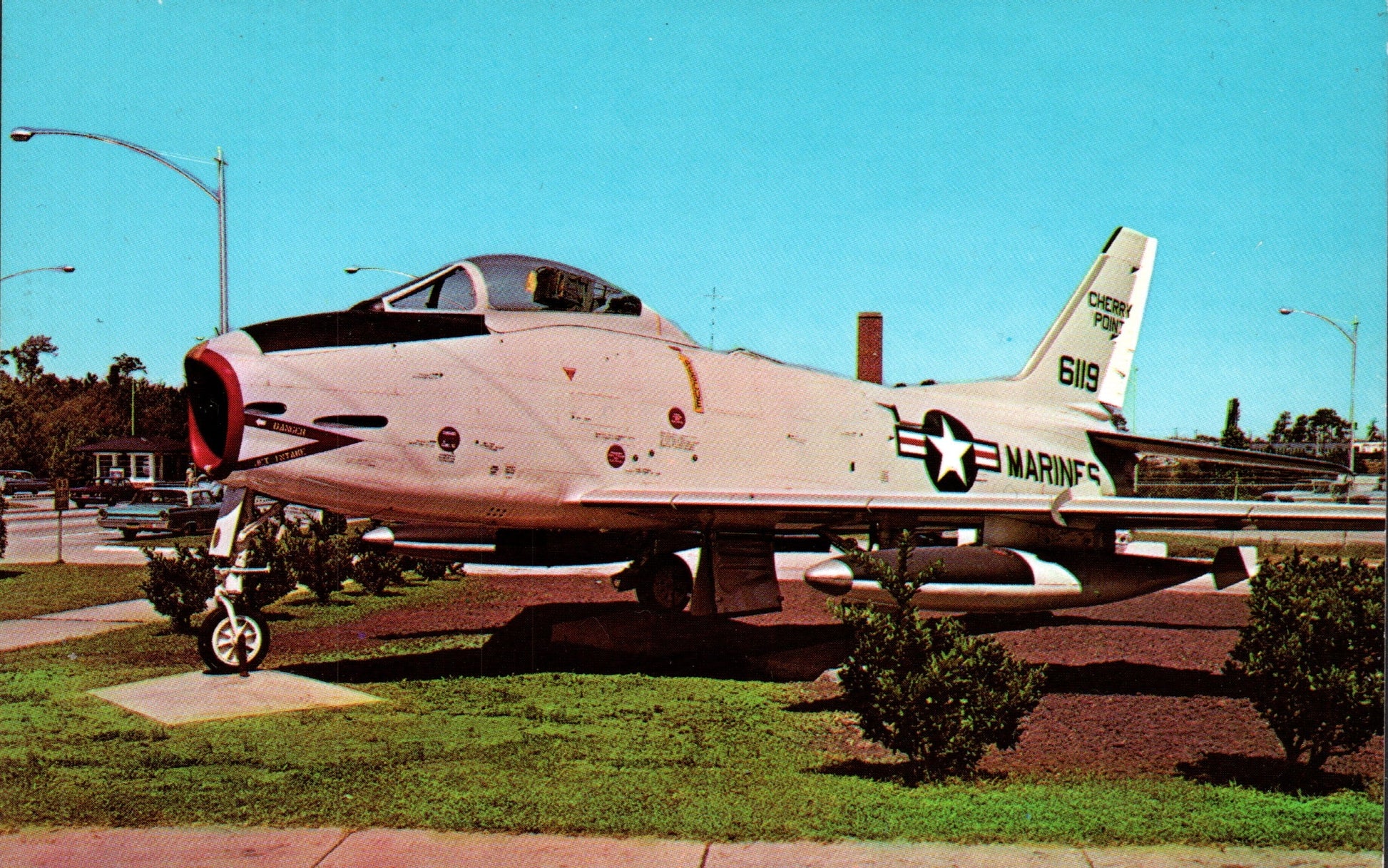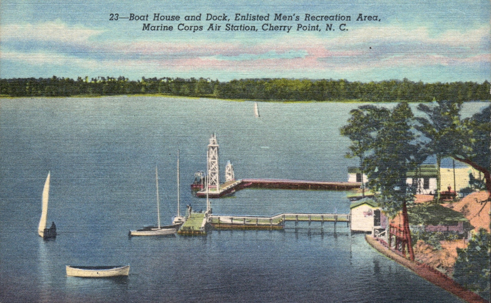 Post cards: F-34 at Main Gate [chrome]; Recreation Area, docks [linen]