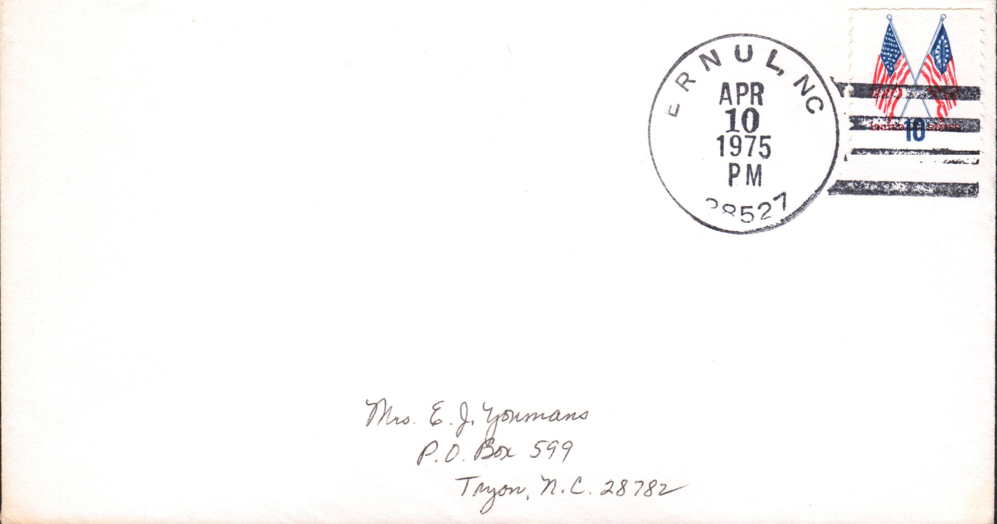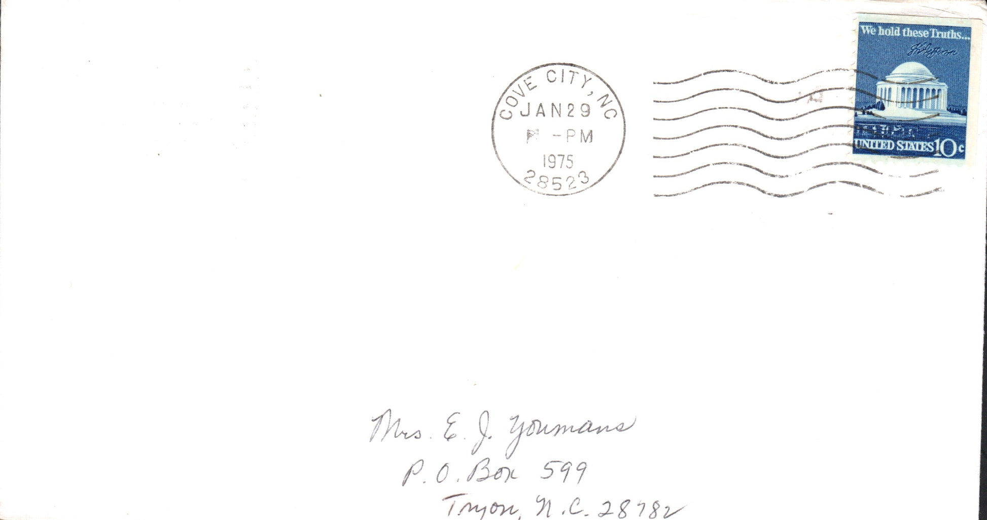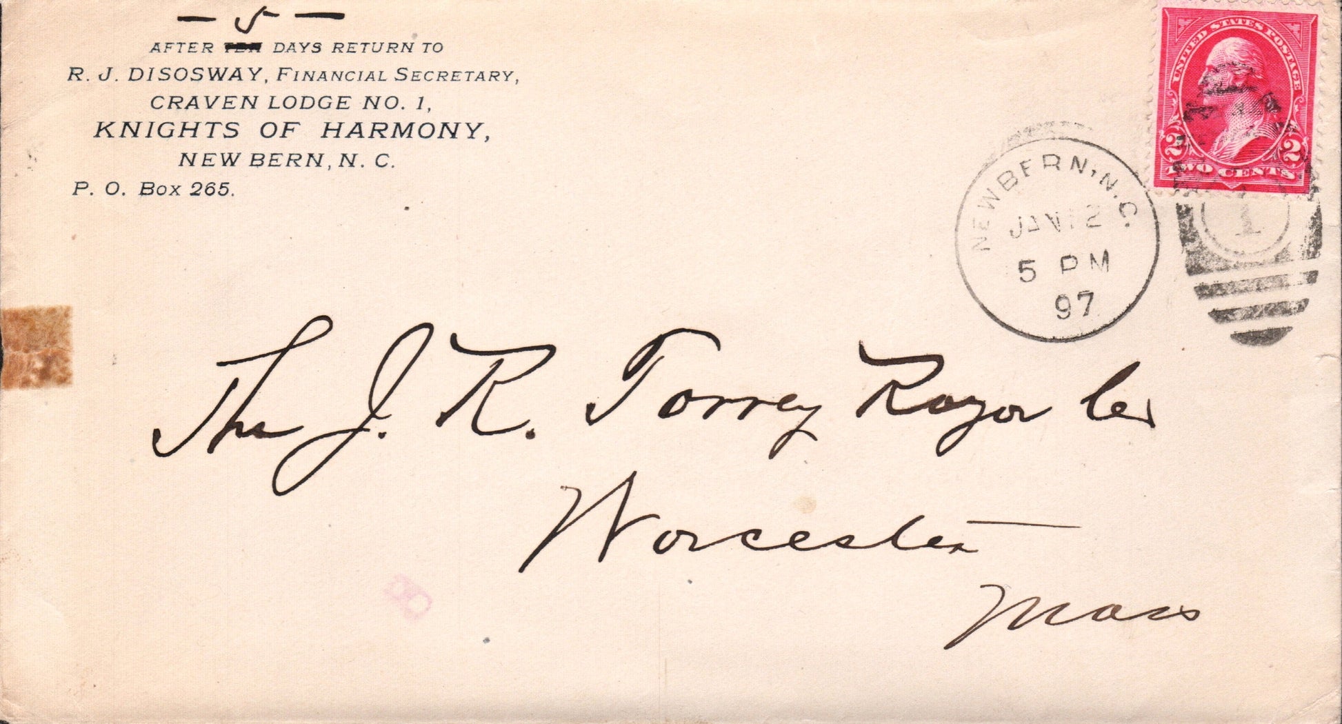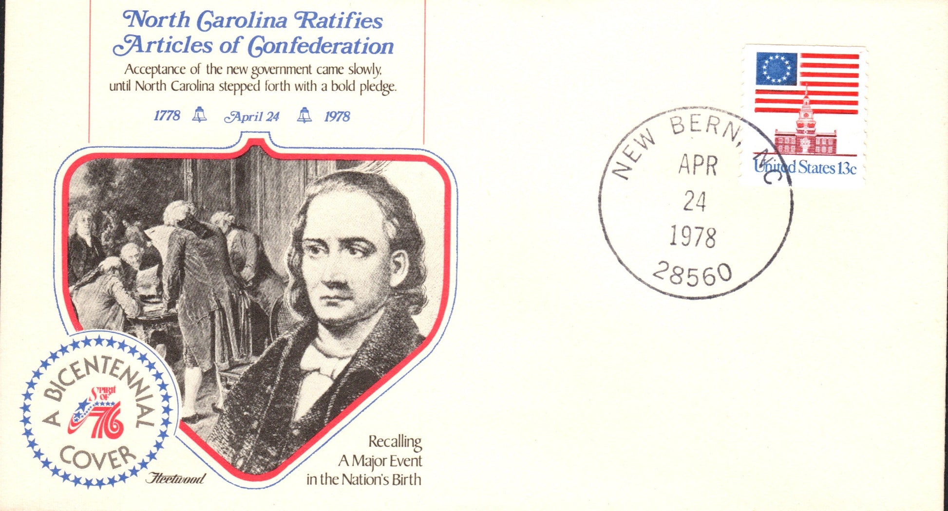 New Bern 1897 duplex on cover, “Knights of Harmony” corner; 1965? roller on cover; 1970 machine slogan “Tryon Palace 100th Anniversary” on cover; 1978 cds on cacheted Bicentennial cover, North Carolina Ratifies Articles of Confederation”