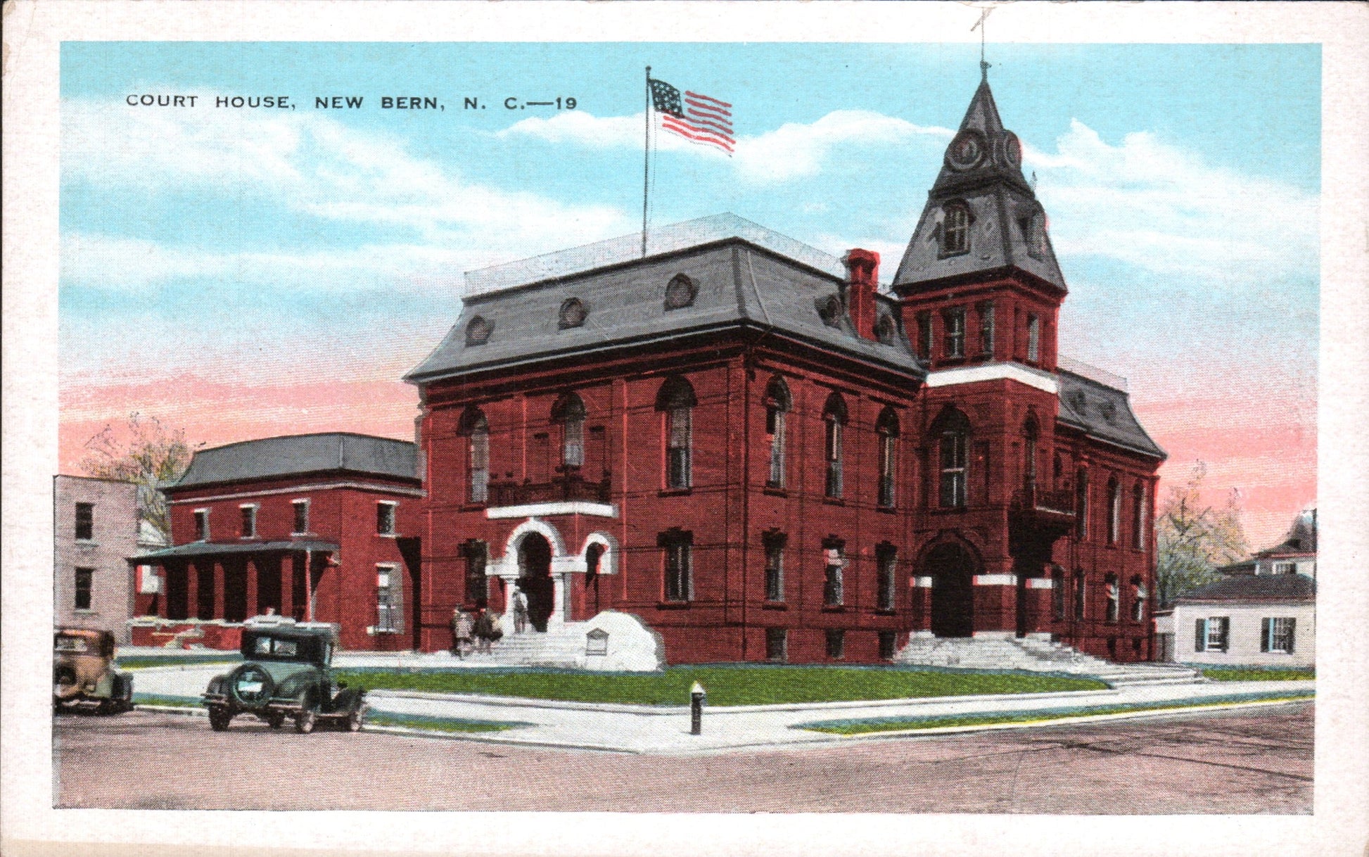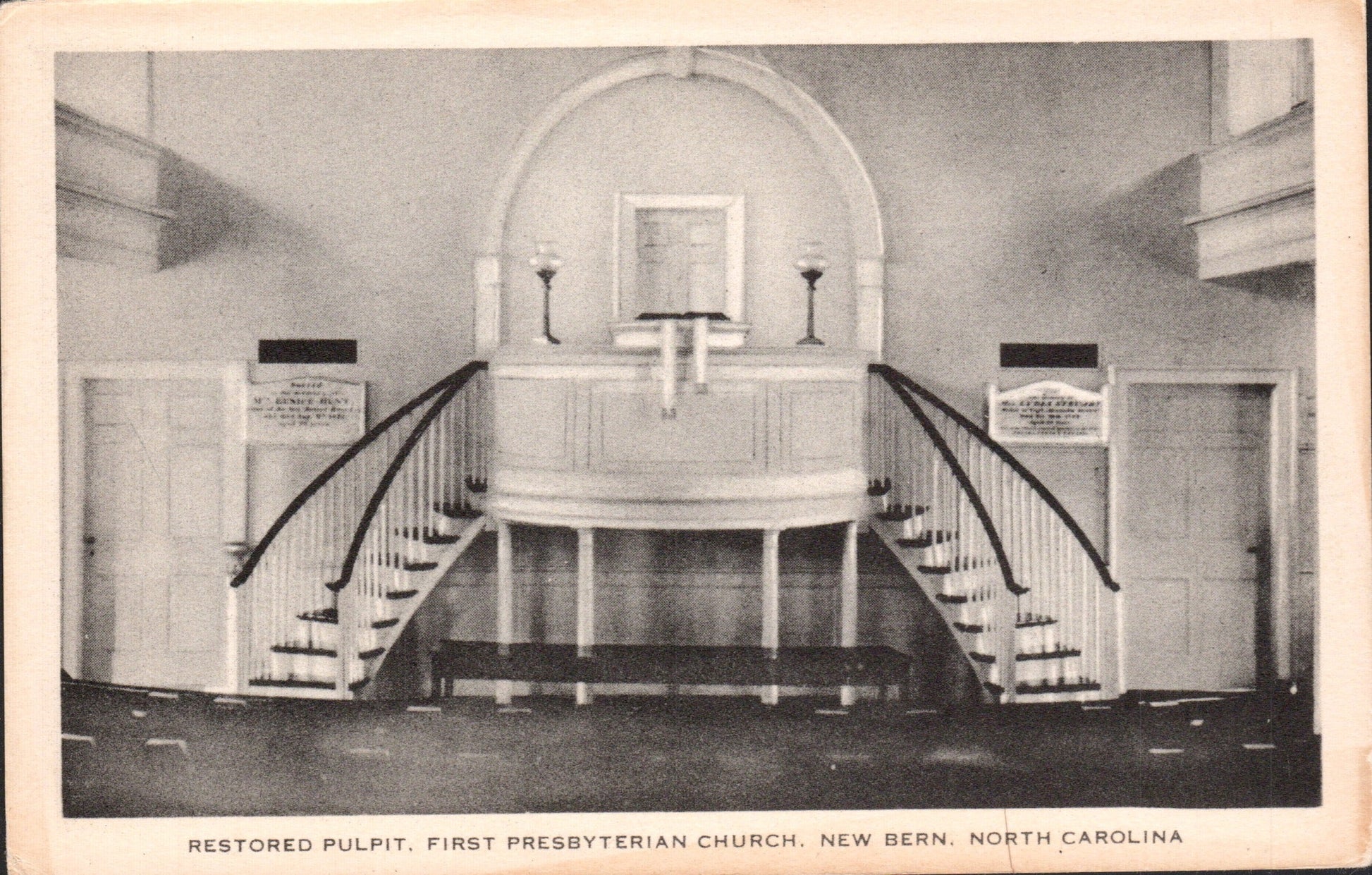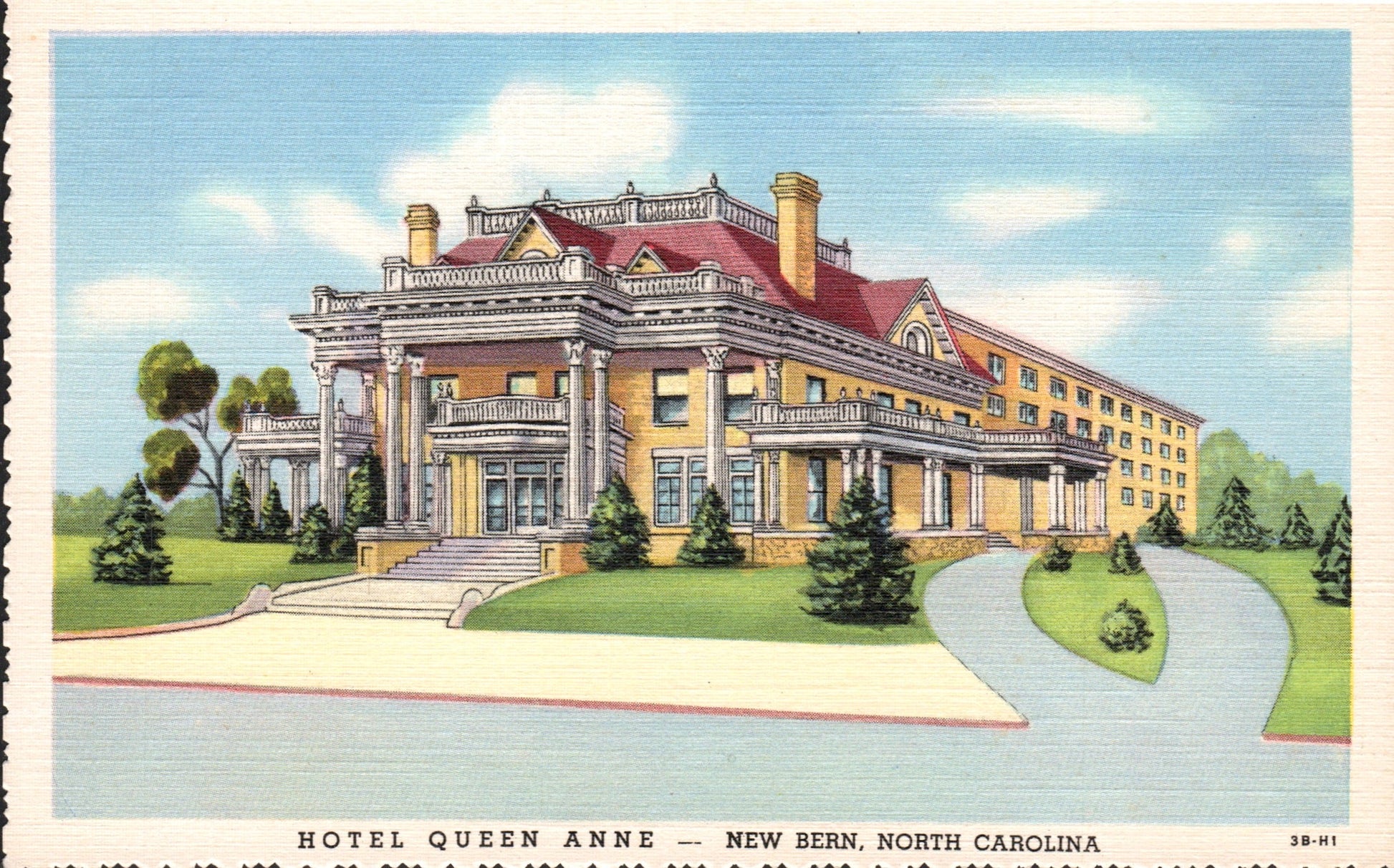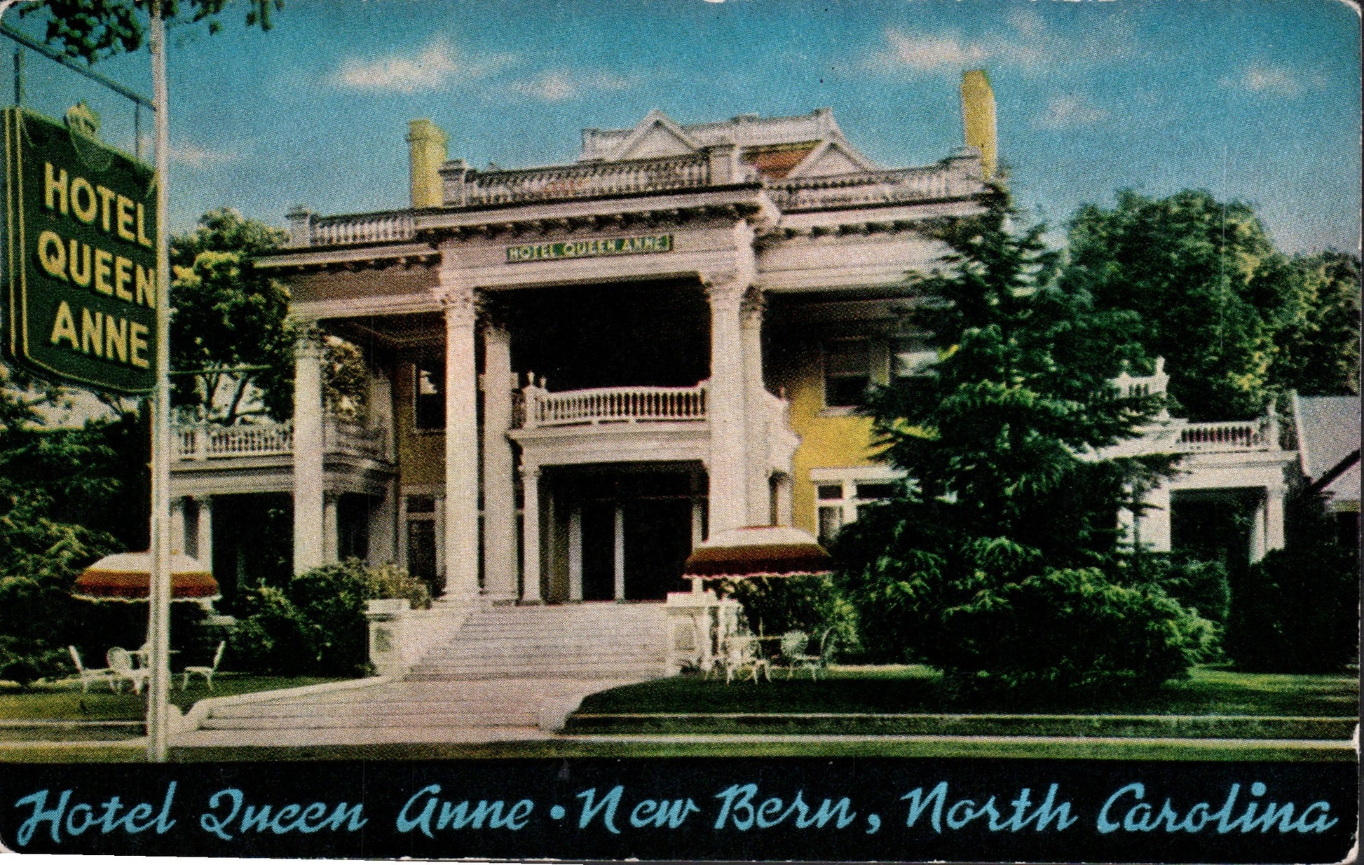 Post cards: Hotel Queen Anne [2 views, one linen, one chrome]; Court House [1920s]; Tryon Palace interior view [chrome]; Christ Episcopal Church [chrome]; Presbyterian Church pulpit [B&W]; Battle of New Bern sign, bridge [chrome]