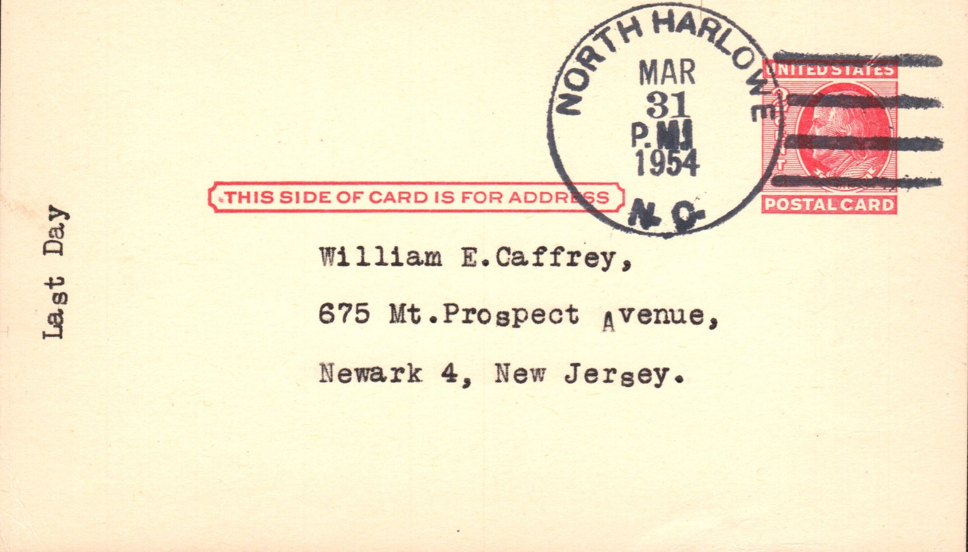 North Harlowe (1893-1954) 1954 4-bar on LD Postal Card