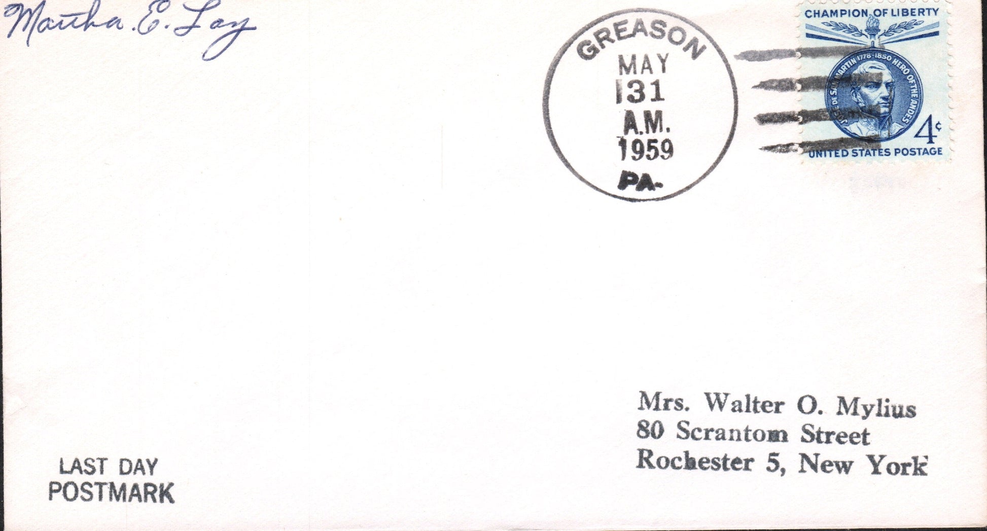 Greason (1864-1959) 1959 4-bar on LD cover, PM autograph
