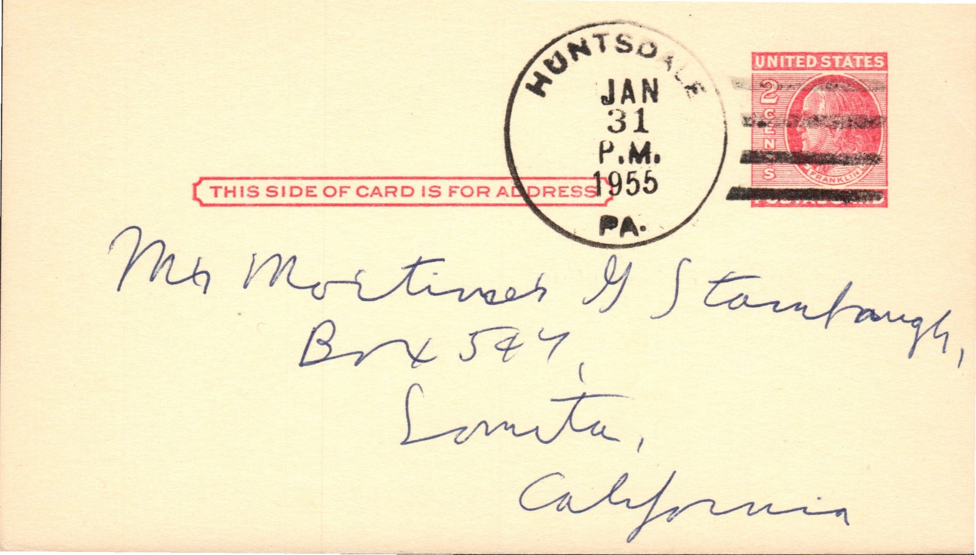 Huntsdale (1882-1955) 1955 4-bar on Postal Card