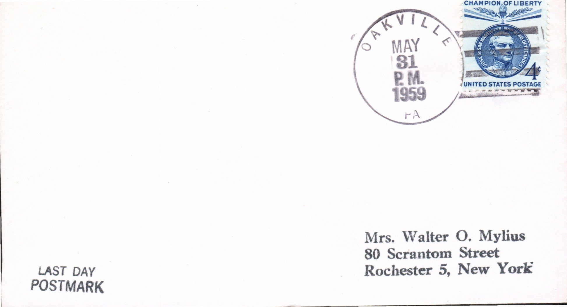 Oakville (1848-1959) 1910 Doane 3 as rec’g. (stained); 1913 4-bar as recg. mark; 1959 4-bar on LD cover