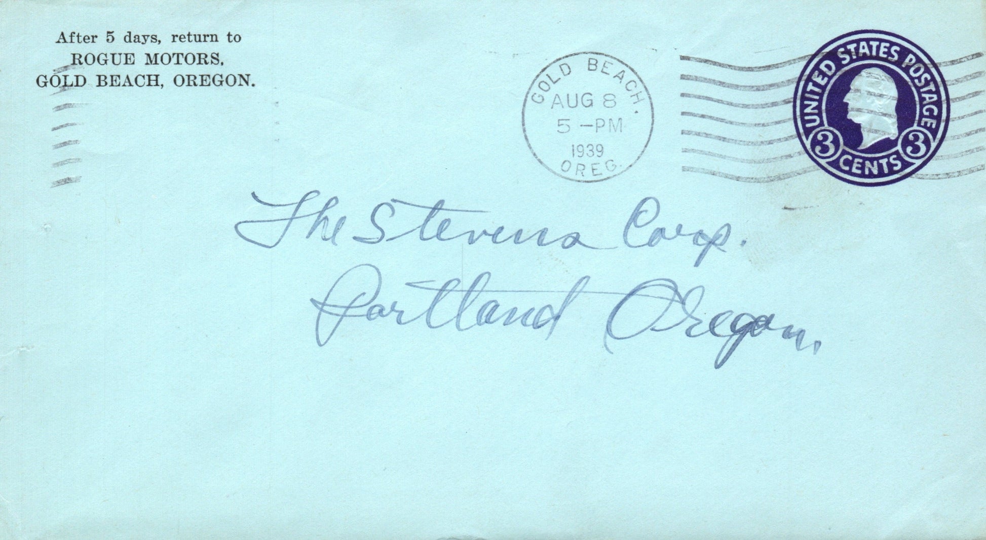 Gold Beach 1939 machine cancel on blue cover, “Rogue Motors” corner