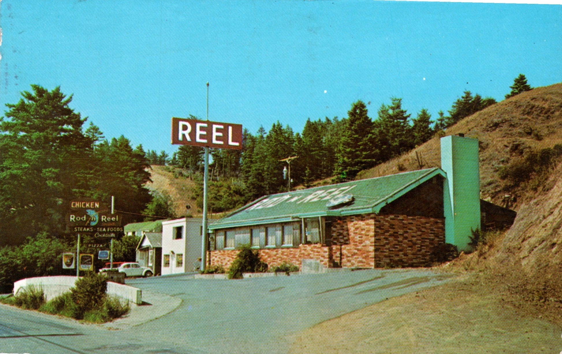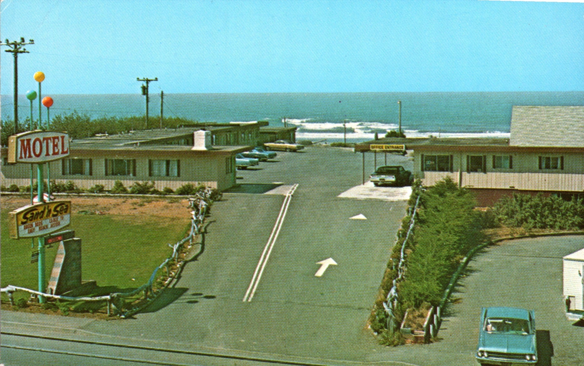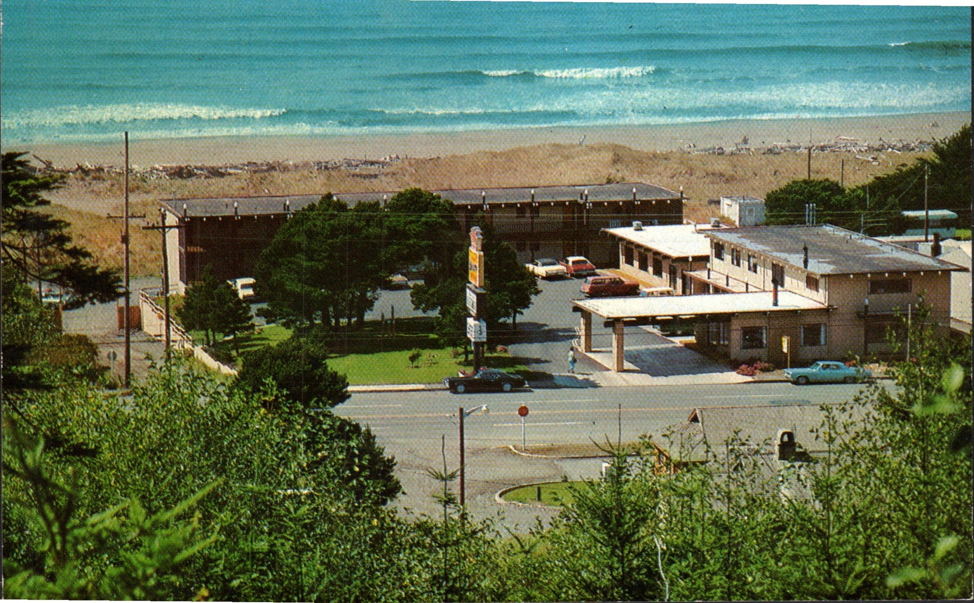 Post cards: Aerial view (real photo, Patterson); Main street [chrome]; Edge o’Town Motel [chrome]; Inn of the Beachcomber [chrome]; Leith Motel [chrome]; Sand ‘n Sea Motel [chrome]