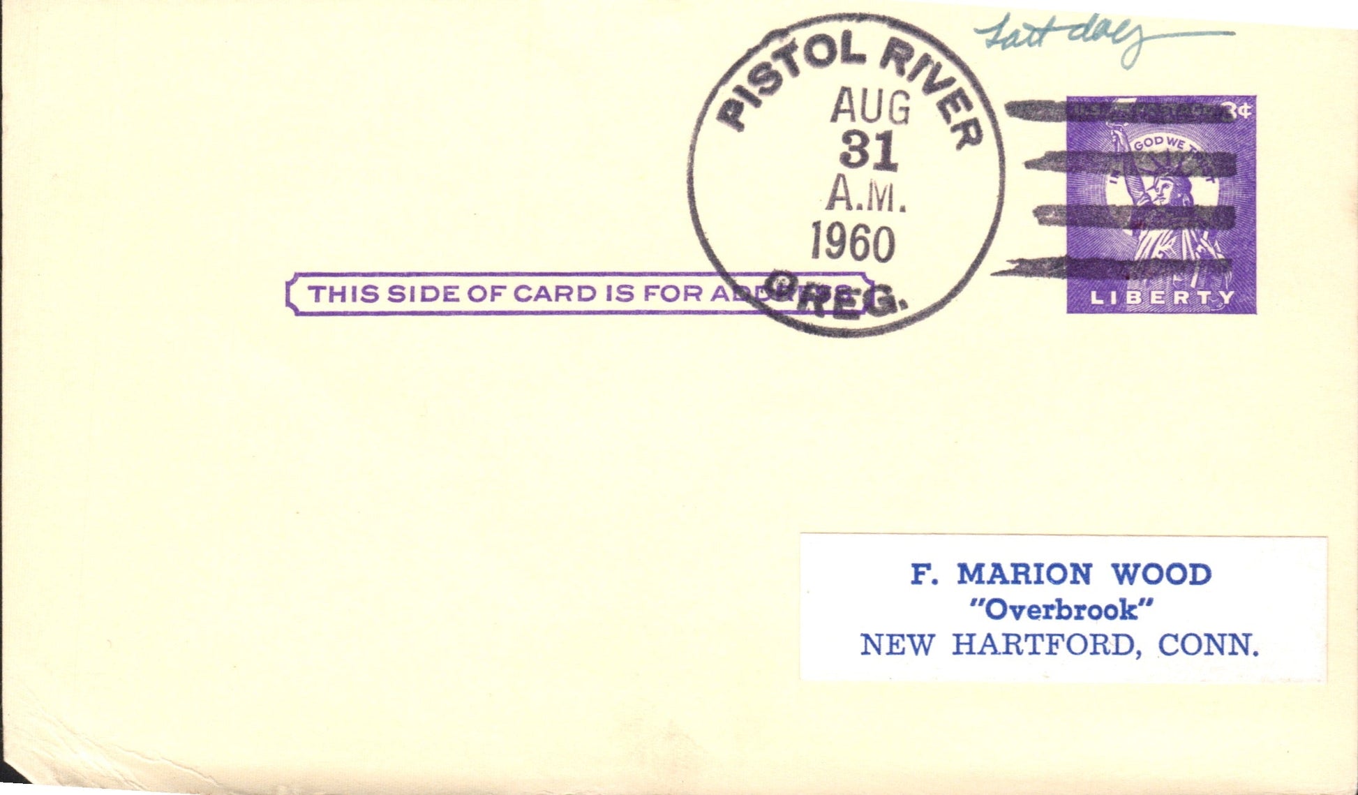 Pistol River (1927-1960) 1960 4-bar on LD Postal Card
