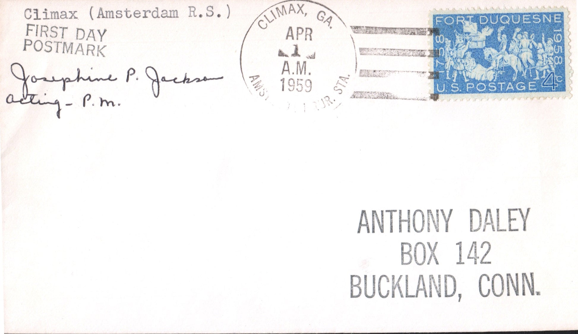 - Amsterdam RB (Climax) poor 1959 4-bar on cover, FD of Rural Branch