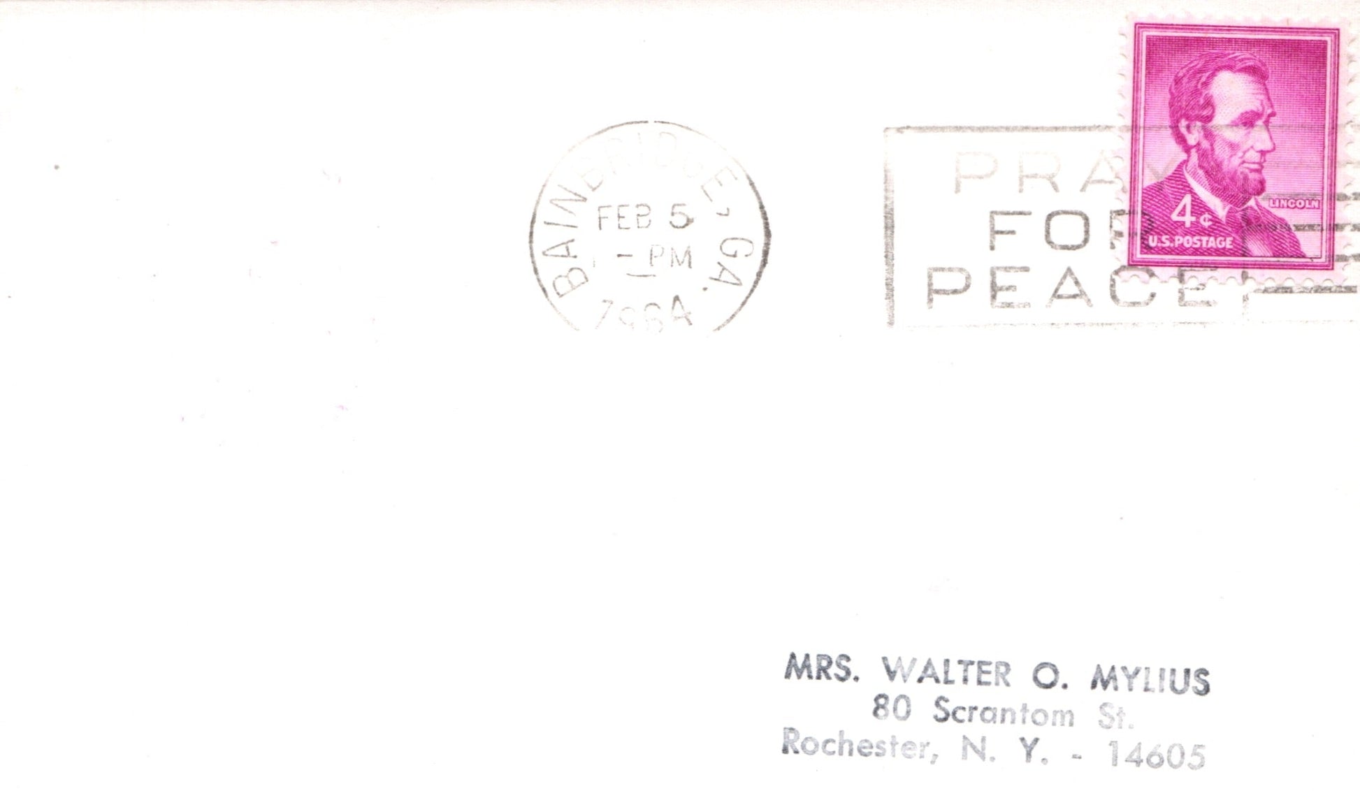 - Bainbridge light 1964 “Pray for Peace” slogan on 3x5 card, round dater and PM autograph on back