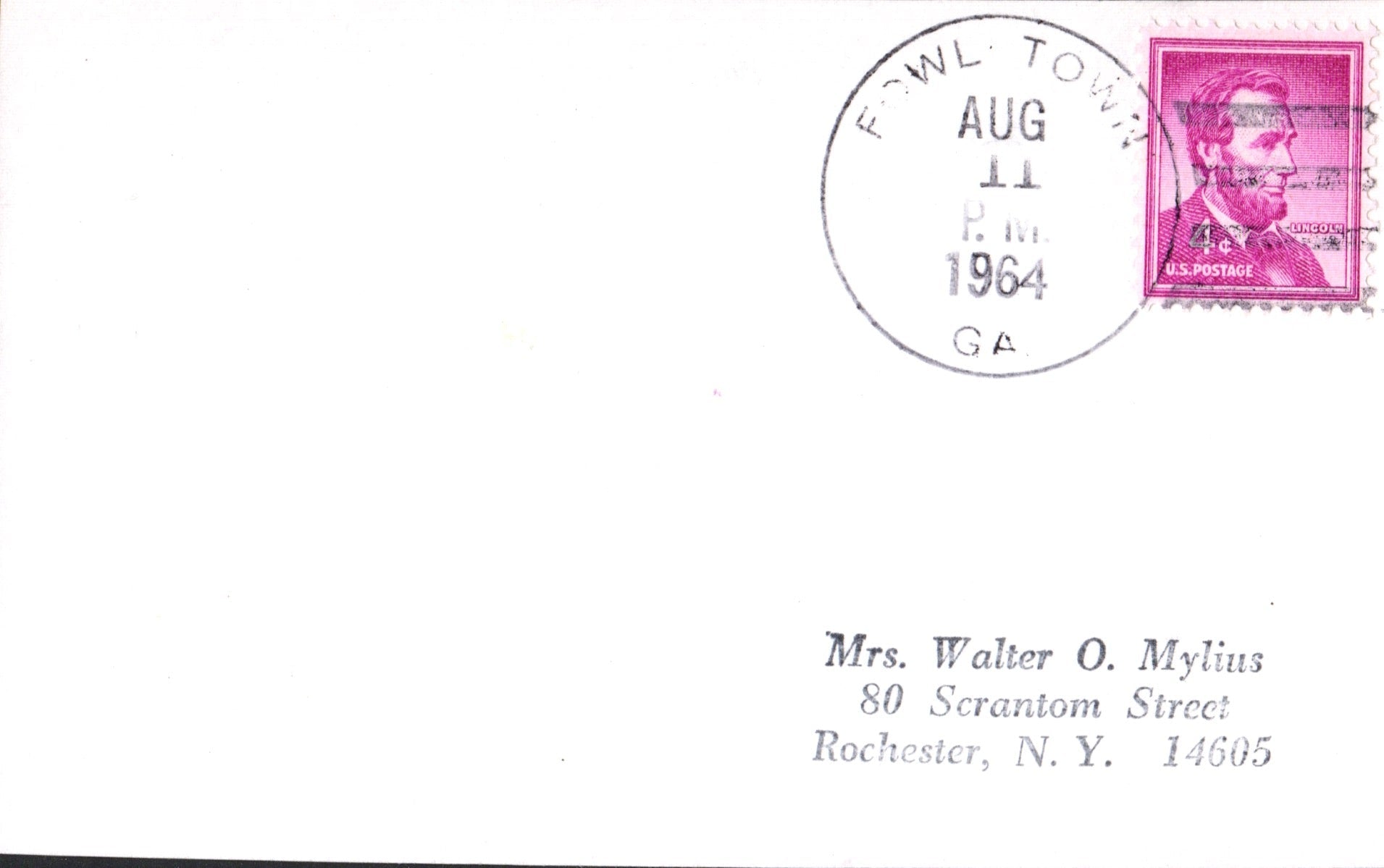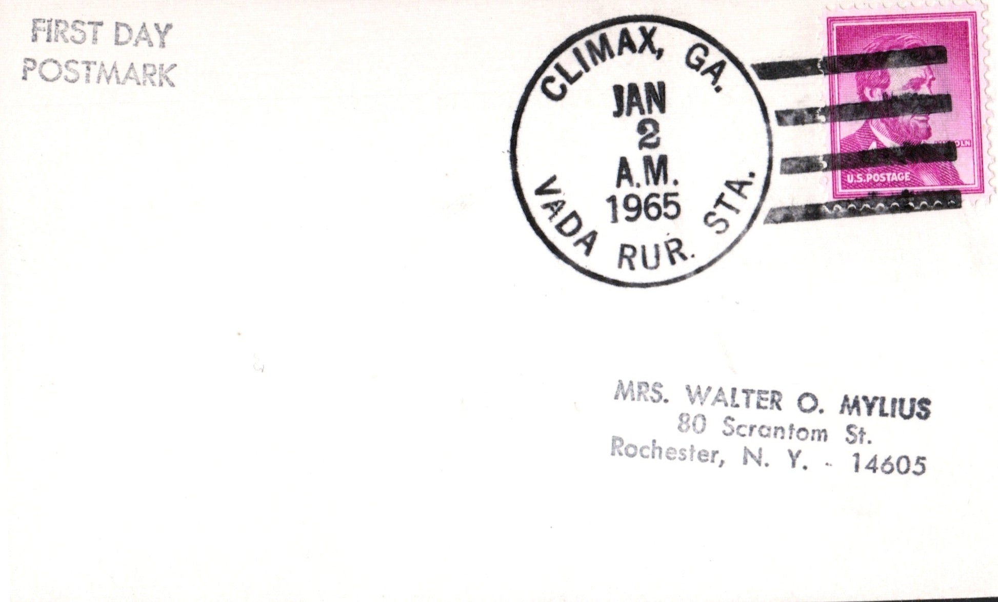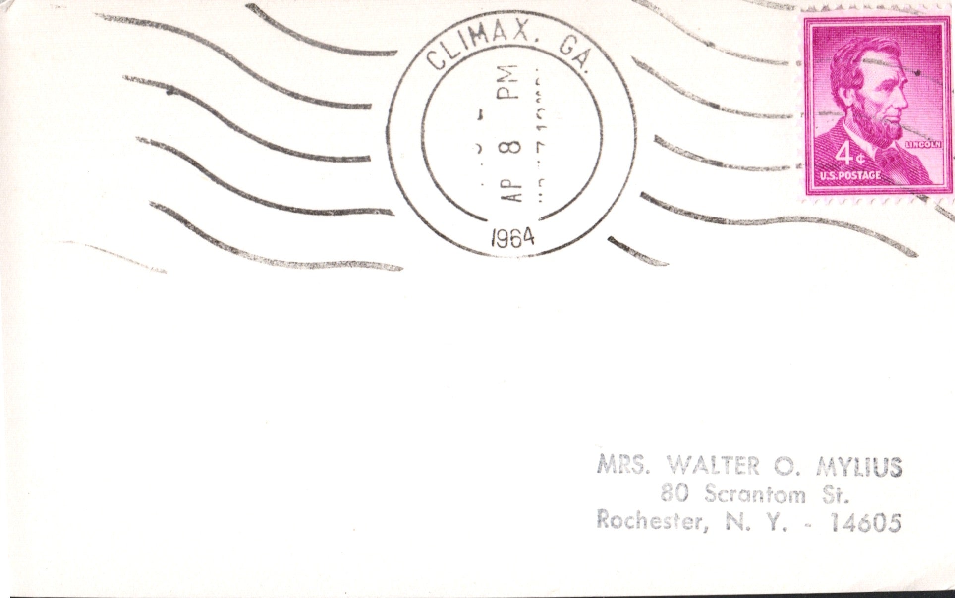 - Climax 1964 roller on 3x5 card, partial round dater and PM autograph on back
