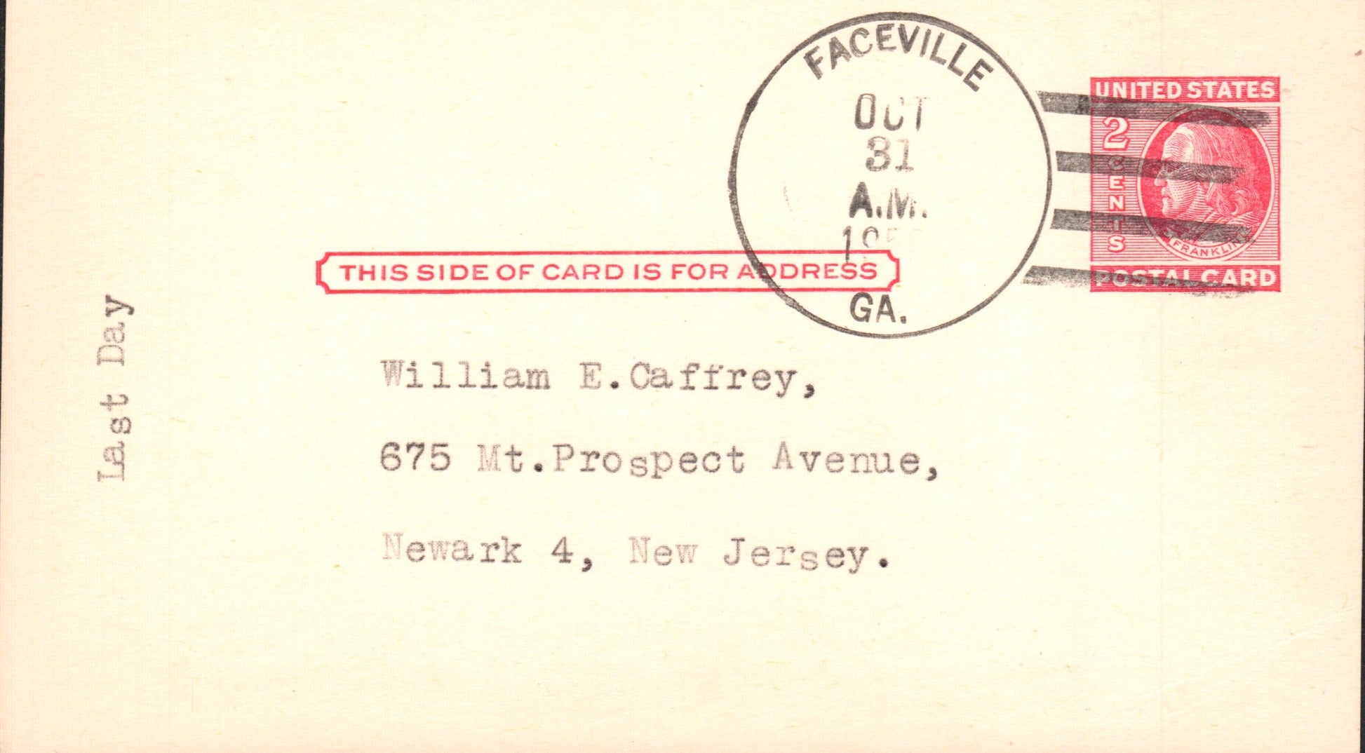 - Faceville (1856-1955) 1957 4-bar on LD Postal Card