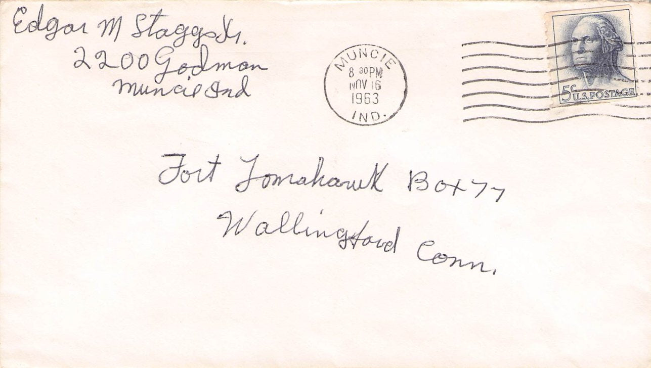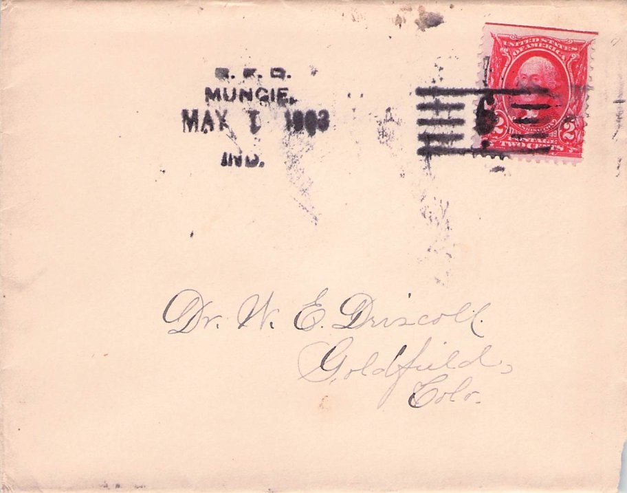 Muncie 1904 Flag cancel on cover w/ backstamp of Goldfield, Colorado (dpo); 1941 machine cancel on cover, R.M. Thomas Co. corner; 1963 machine cancel on cover; 1978 machine cancel on cover. Muncie RFD 1903 hand stamp with “6” in bars, Goldfield, Colo. backstamp.