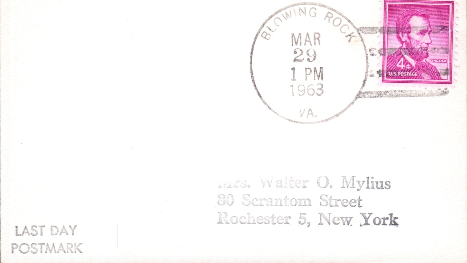 Blowing Rock (1908-1963) 1963 4-bar on LD 3x5 card, PM autograph on back