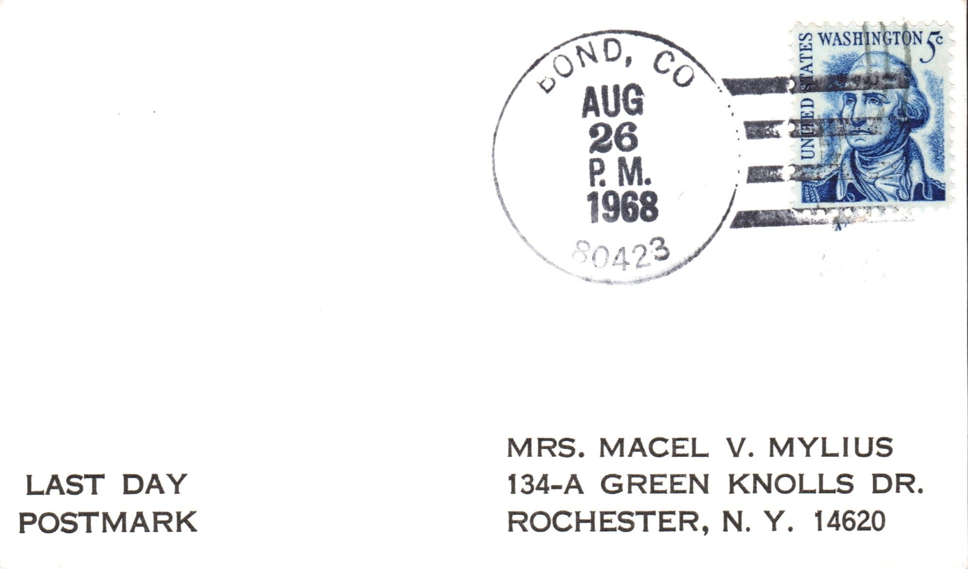 Bond 1968 4-bar on LD 3x5 card, round dater and PM autograph on back
