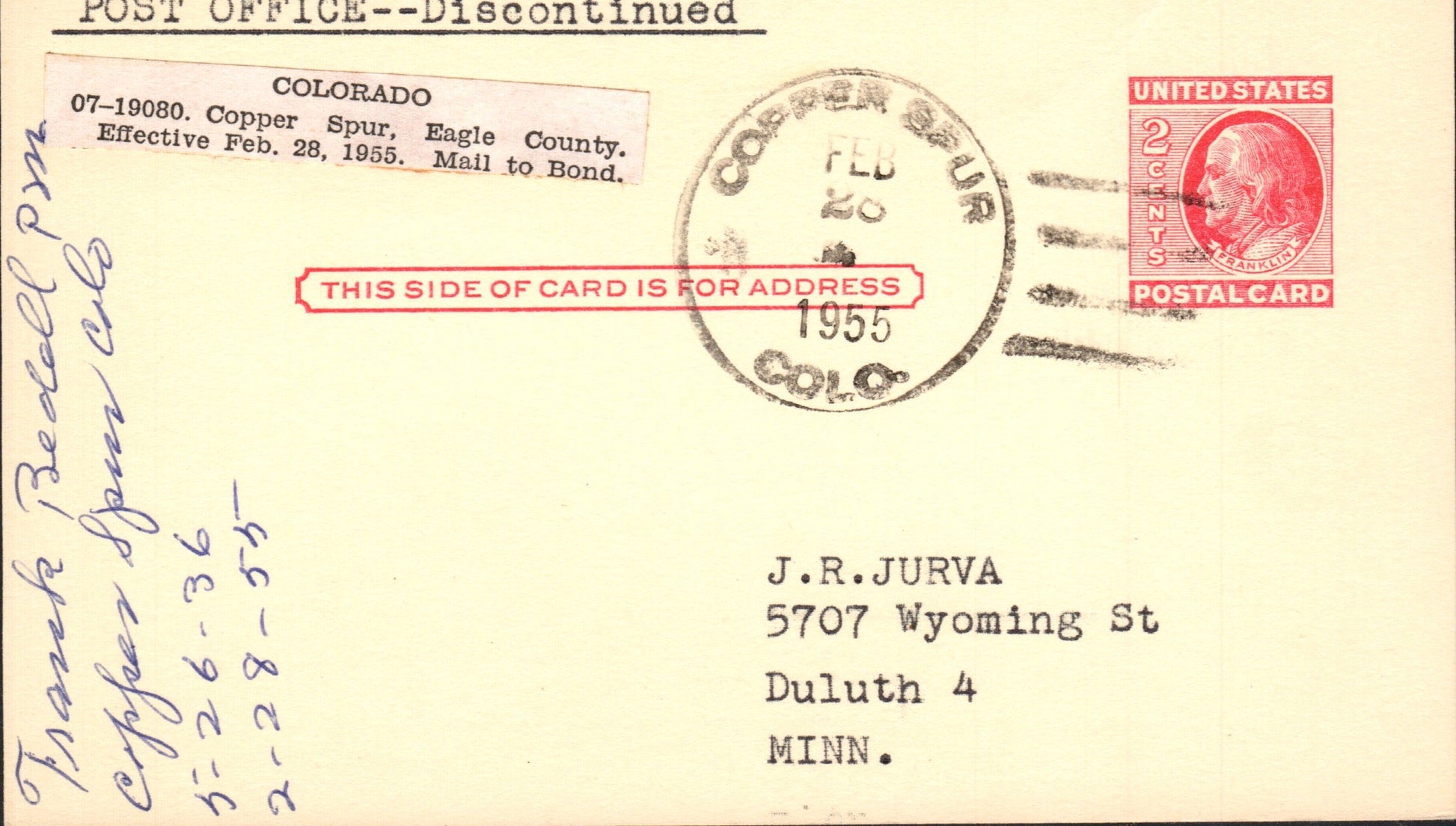 Copper Spur (1929-55) 1955 4-bar on LD Postal Card, PM autograph