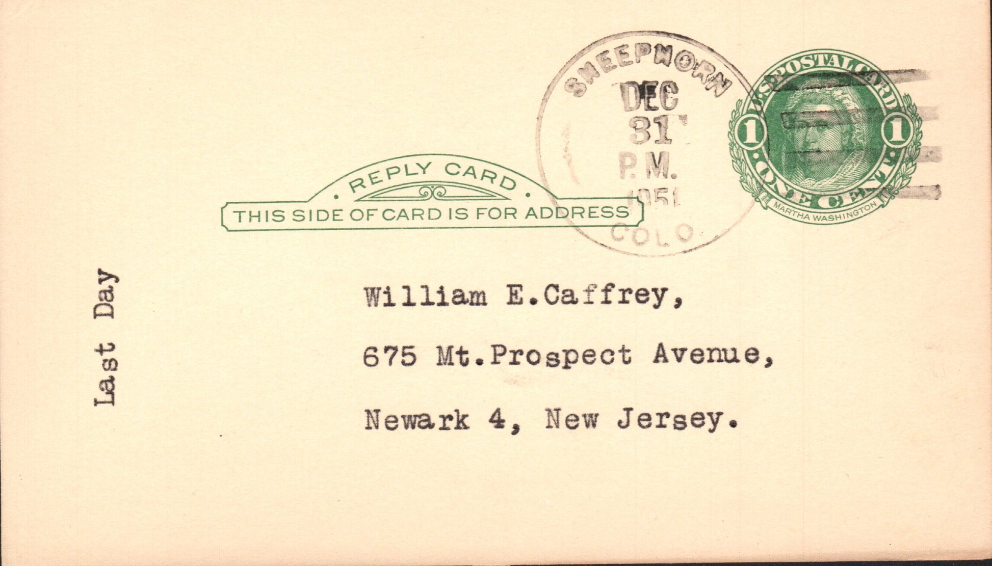 Sheephorn (1895-1951) 1951 4-bar on LD Postal Card