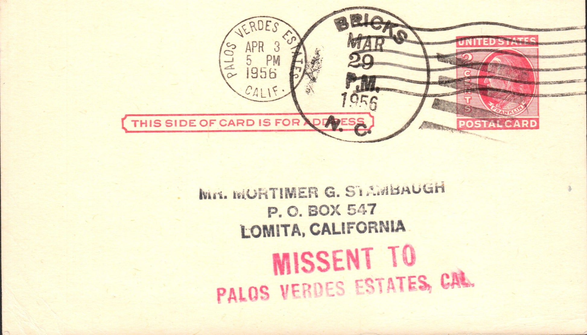- Bricks (1912-1968) 1955 4-bar on Postal Card, overstruck Palos Verdes Estates (Calif.) and with auxiliary (Missent to Palos Verdes Estates)