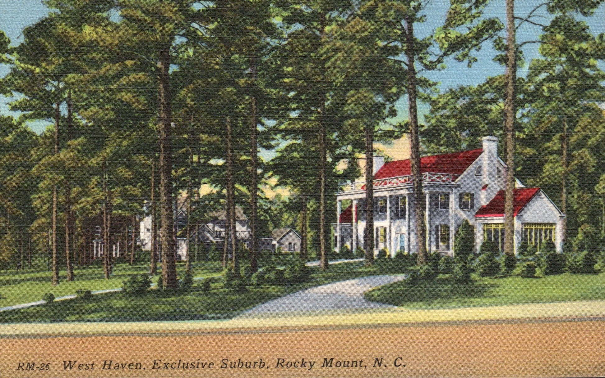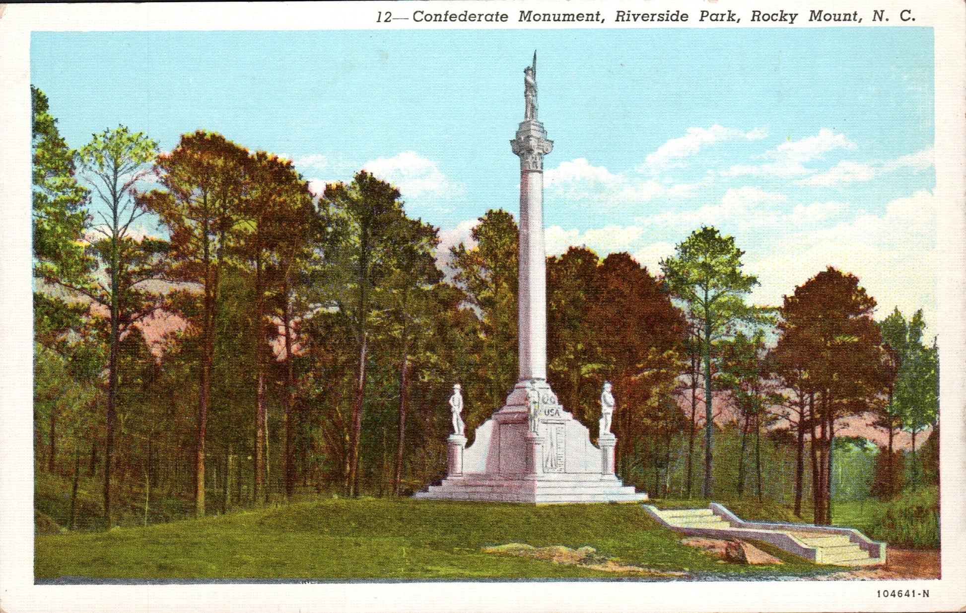- Post cards: “Hal Orr’s Motel” [chrome]; “Atlantic Coast Line Depot” [2 linen views, one has baggage carts]; “Municipal Lake and Power Plant” [linen]; Post office [linen]; Benvenue Country Club [linen]; “Confederate Monument” [linen]; “City Park” [linen]; “West Haven, Exclusive Suburb” [linen]