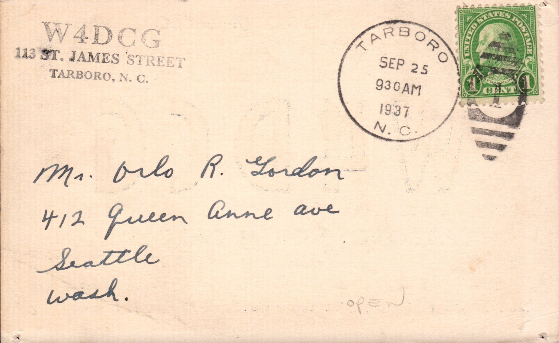 - Tarboro 1937 duplex on ham radio post card.