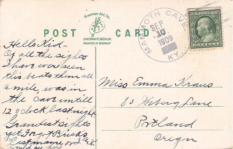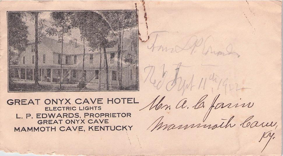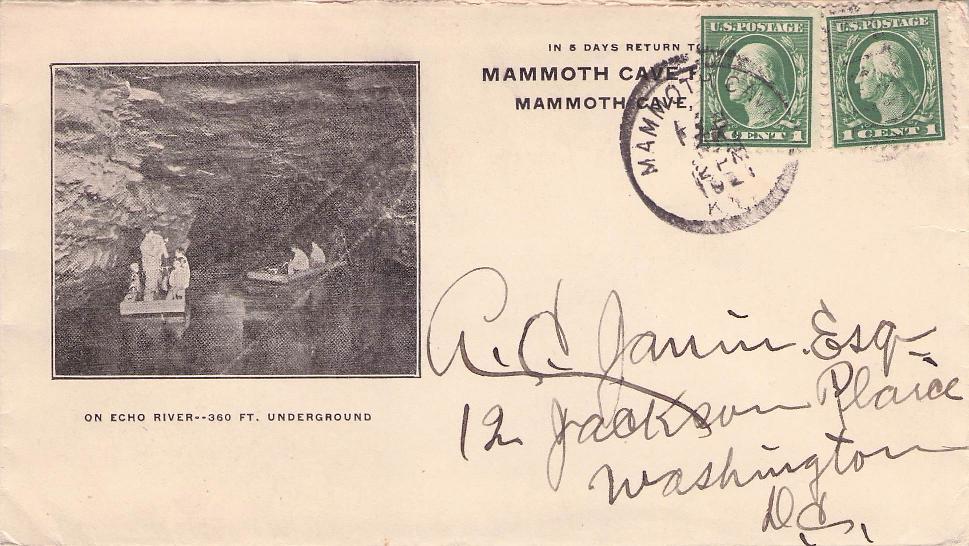 - Mammoth Cave 1909 4-bar on post card, view of cave entrance; 1918 4-bar on cover, “Demunbrun & Dossey General Merchandise” corner; poor 1921 duplex on illustrated cover, view of boating on Echo River; poor 1921 duplex on cover, cachet photo “On Echo River - 350 ft. underground”; unpostmarked 1922 cacheted cover “Great Onyx Cave Hotel. Electric lights” [photo of hotel][paper-clip mark];