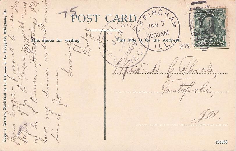 - Effingham 1908 date-out duplex on post card (view of High School), also Teutopolis Rec’d; 1935 date-out duplex on cover, “Loving’s Furniture Store” corner