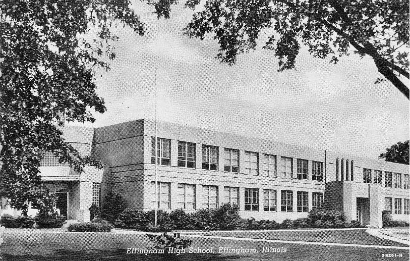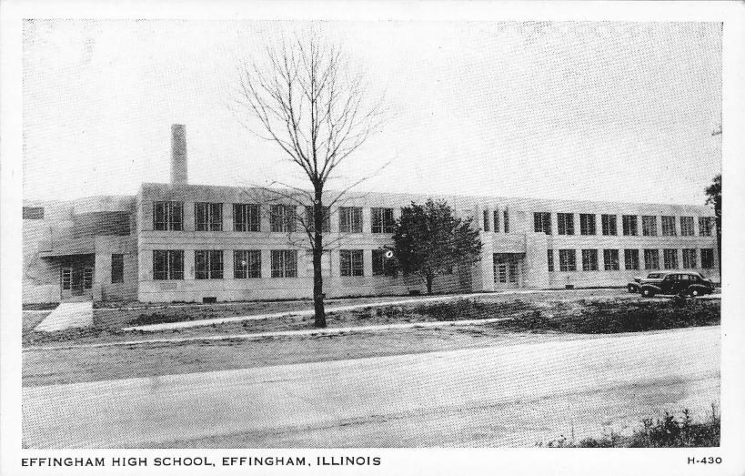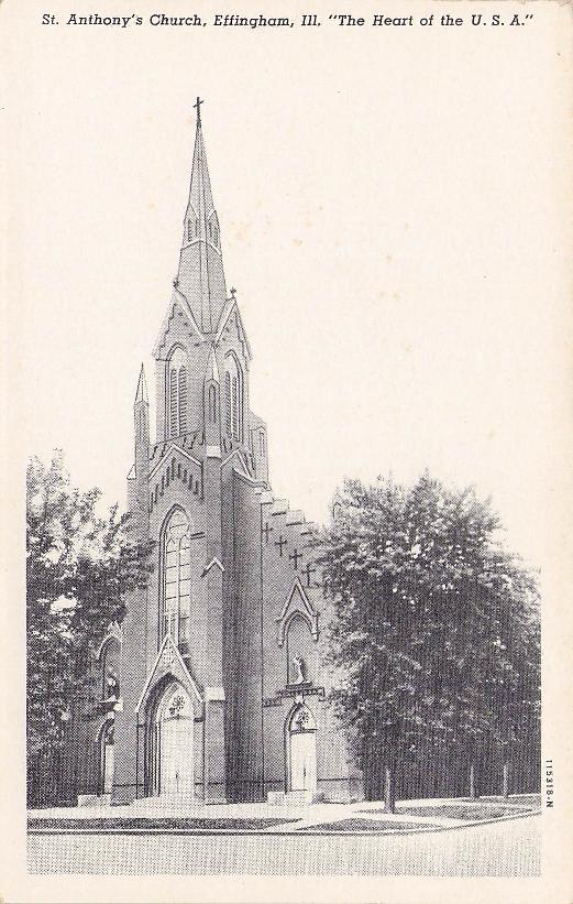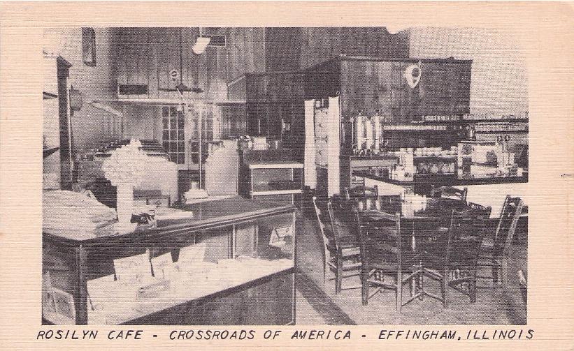 - Post cards: Effingham Motel [linen]; Sleepy Hollow Motel [chrome]; Rosilyn Cafe “Crossroads of America, delightful interior view of counter, dining area [B&W, undated but early]; High School [2 B&W views]; St. Anthony Hospital [real photo]; Lutheran Church [real photo]; St. Anthony’s Church [B&W]
