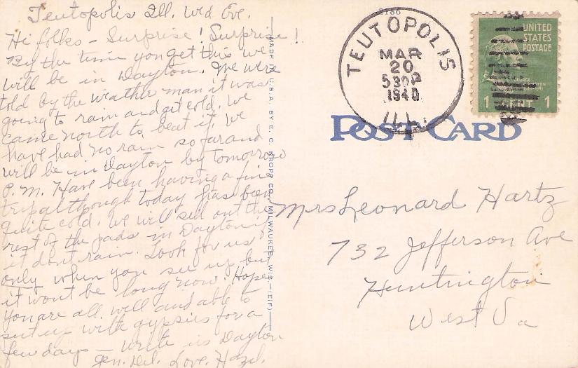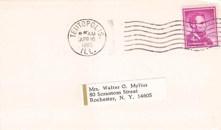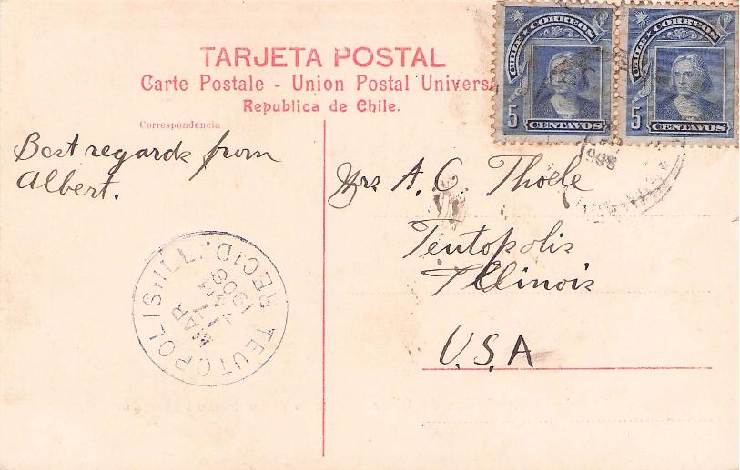 - Teutopolis 1908 Rec’d mark on post card from Chile, two 5 centavo stamps; 1940 duplex on post card; 1965 machine cancel on 3x5 card