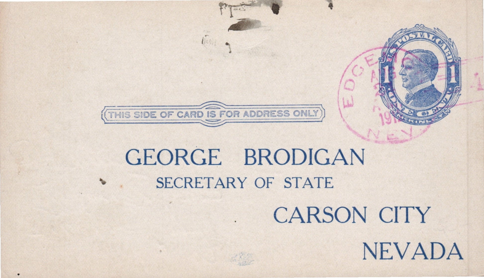 Shafter 1922 4-bar in purple slightly off top of post card, but since cancel was applied upside-down only part of “NEV” is affected