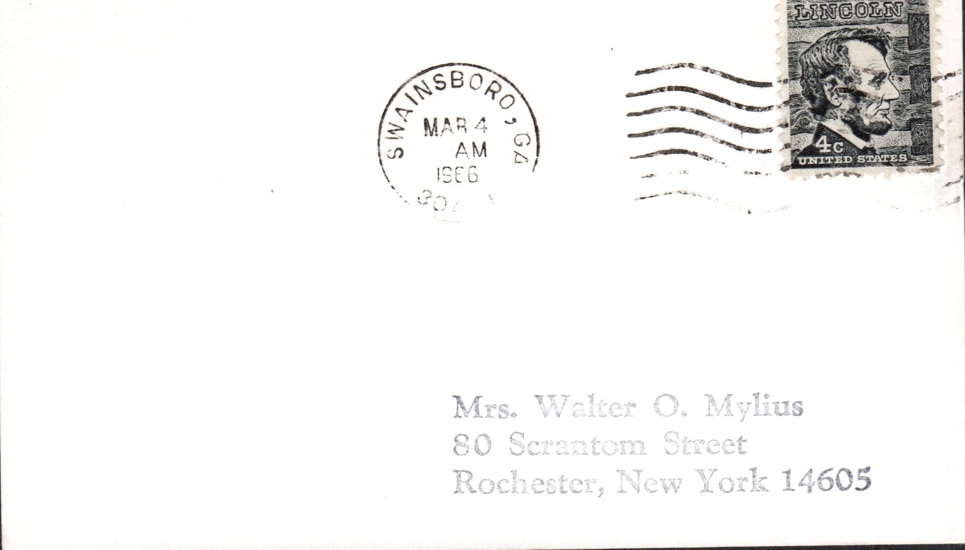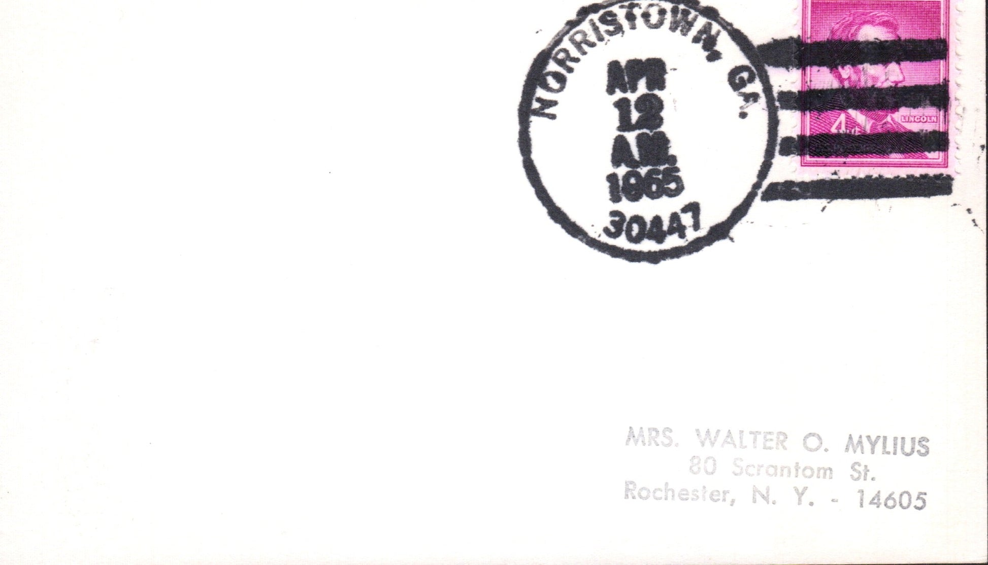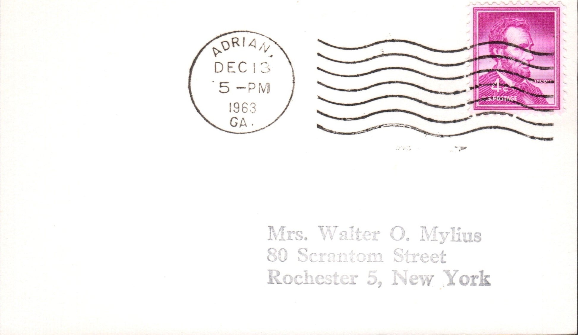 - Adrian 1963 machine cancel on 3x5 card, PM autograph on back
