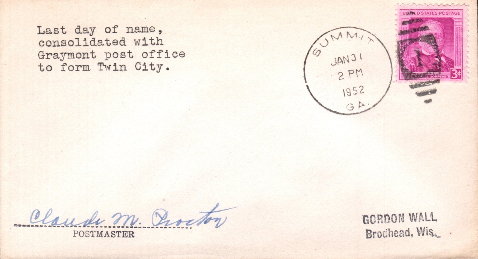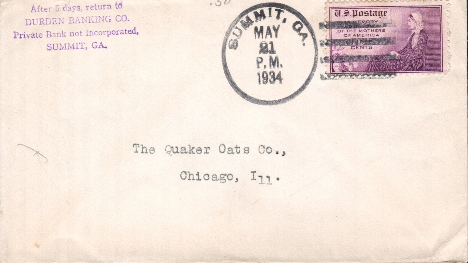 - Summit (1997-1954) 1934 4-bar on cover, “Durden Banking Co.” corner; 1952 duplex on LD cover, PM autograph