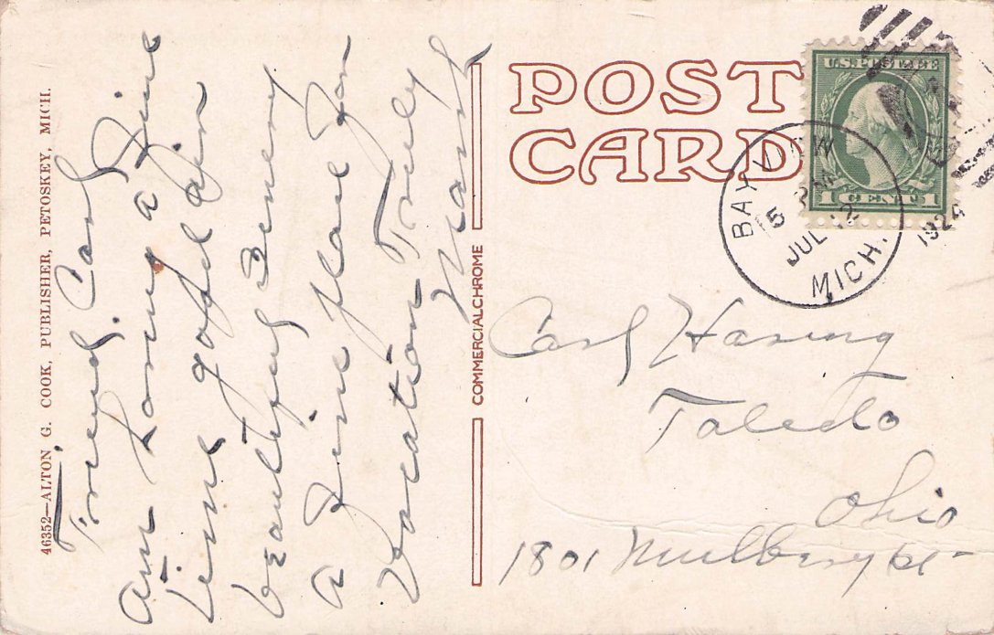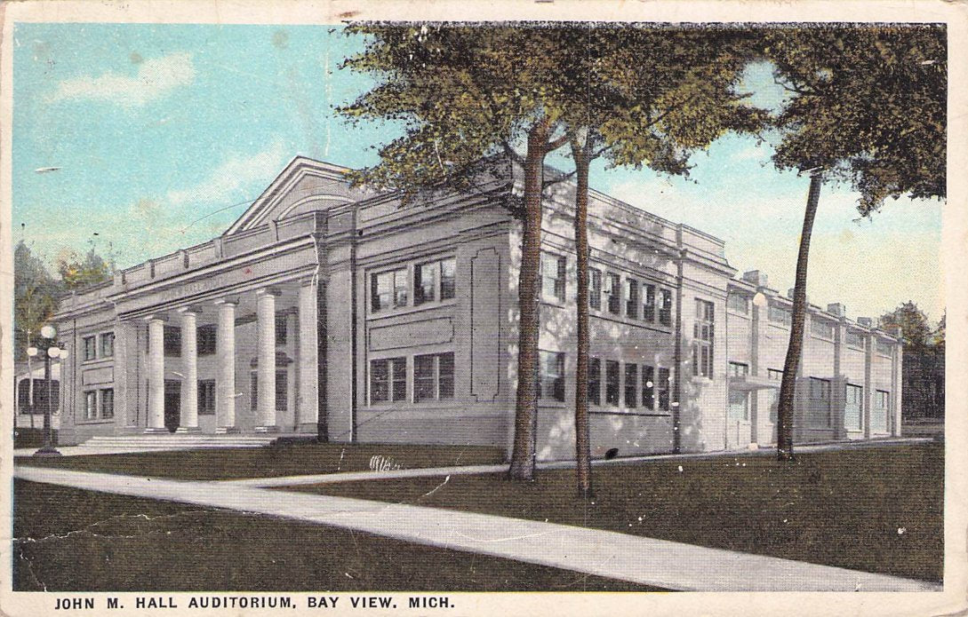 Bayview Bx 1924 duplex on post card (John M. Hall Auditorium), only 12 days after being designated a branch p.o. Railroad Post Office Postmark: 1910? Bayview & Grand Rapids R.P.O. duplex on post card