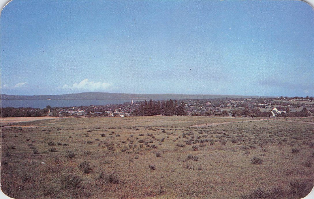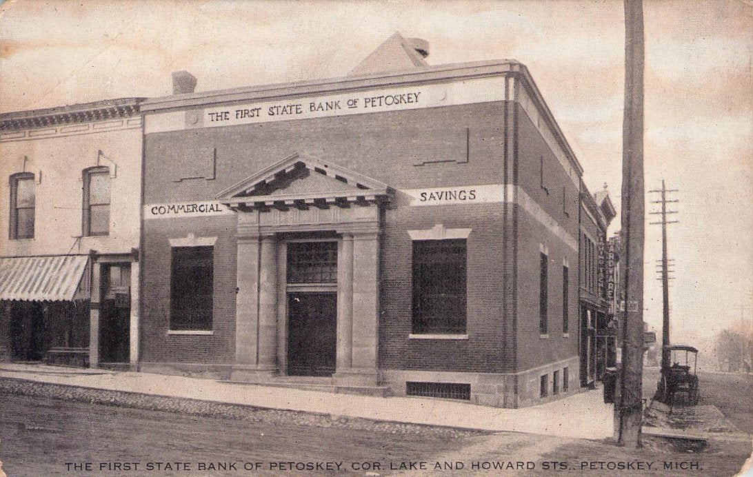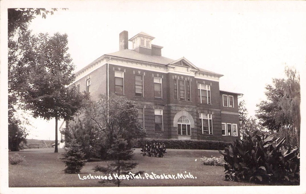Petoskey Post cards: “First State Bank of Petoskey” [B&W, c. 1910]; “Birdseye view” [chrome]; Lockwood Hospital [real photo]; “Magnus Park” [chrome].