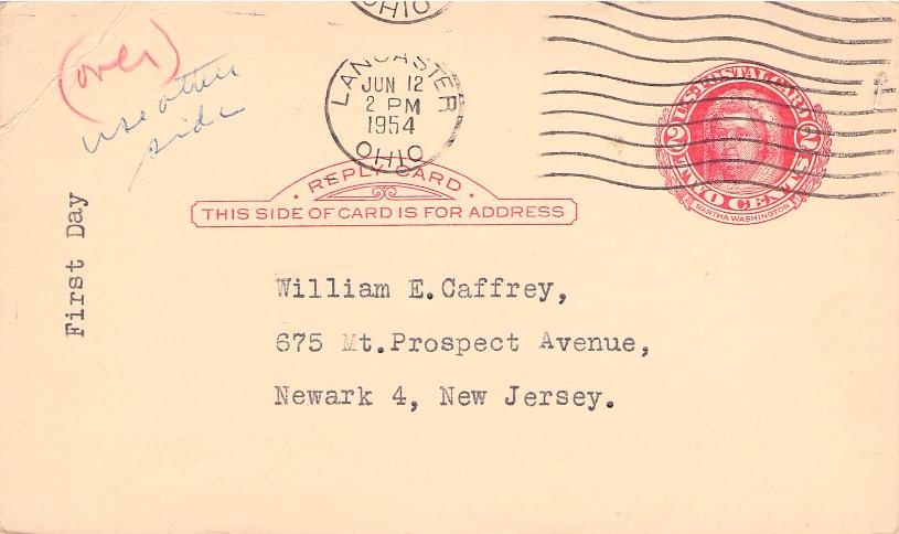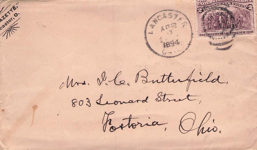 Lancaster 1894 duplex 2¢ Columbian stamp on cover, “Gazette” corner; 1909 Flag cancel on post card; 1954 machine cancel on Postal Card.