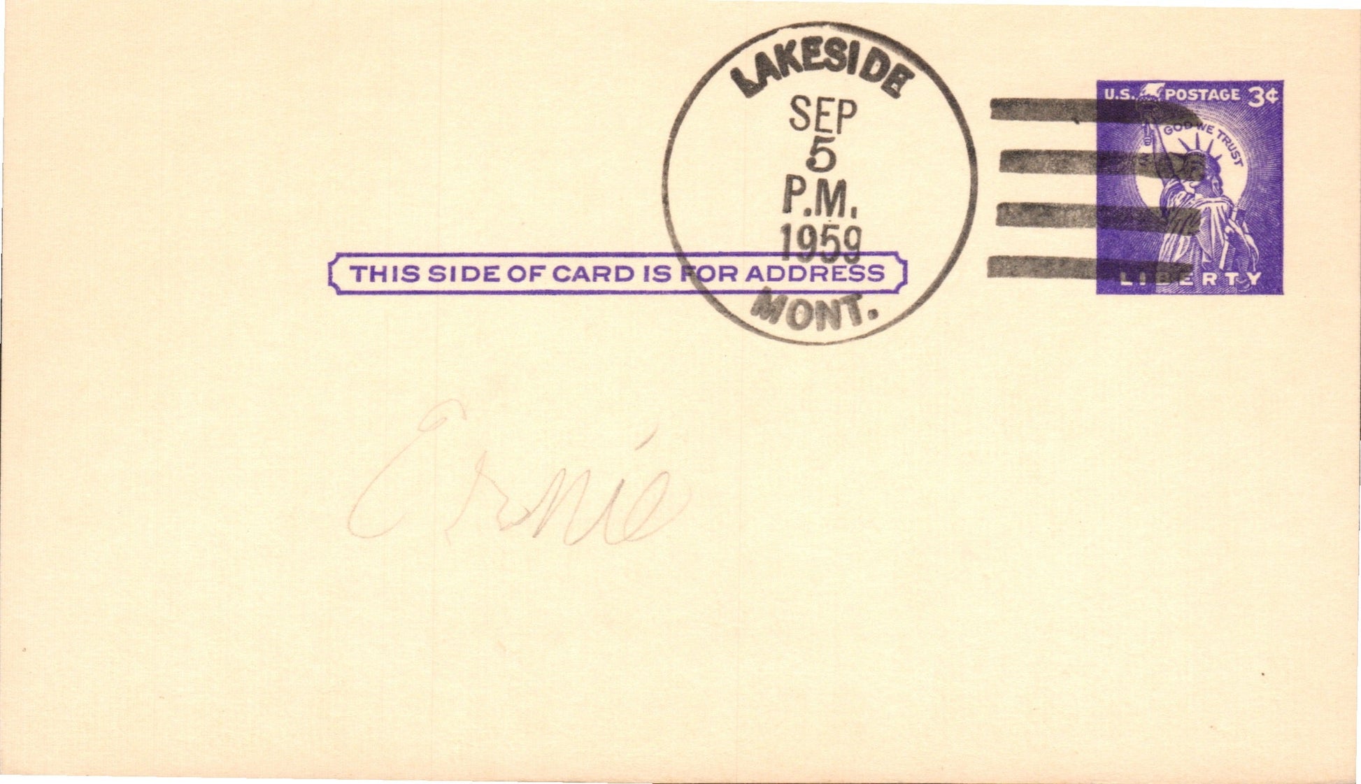 Lakeside 1959 4-bar on unaddressed Postal Card