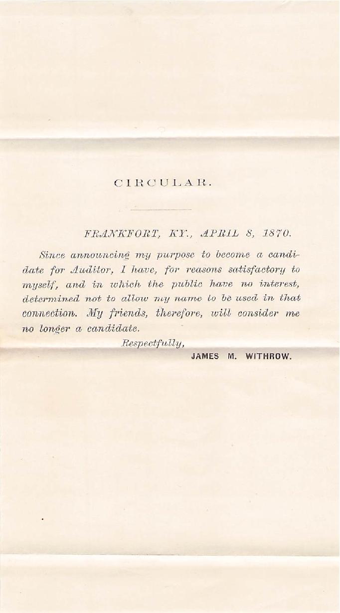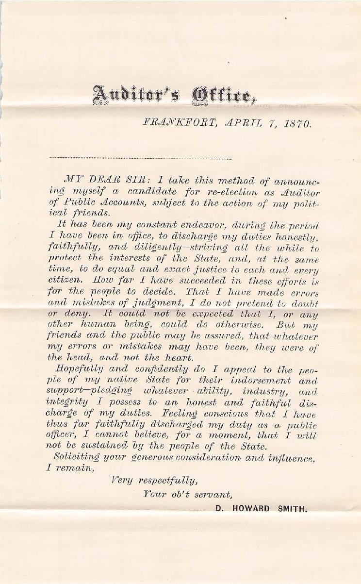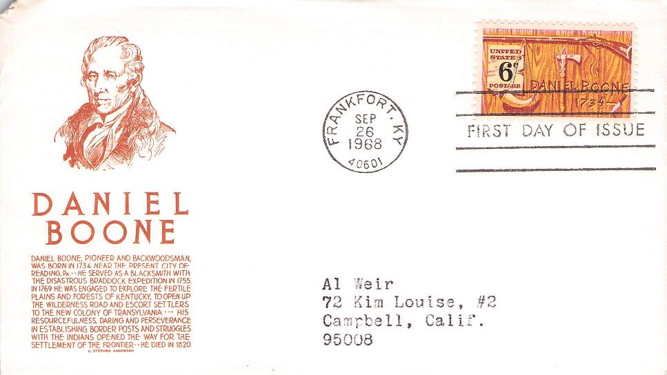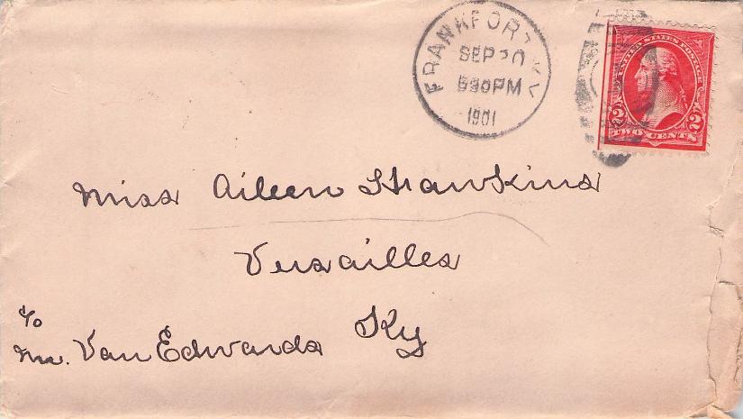 Frankfort 1870 cds on cover w/ two election circulars; 1901 duplex in cover with original contents, Versailles KY backstamp; 1958 “Pray for Peace” slogan on card; Two 1968 FD covers of Daniel Boone stamp (different cachets)
