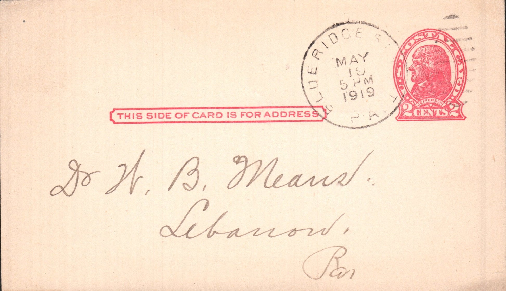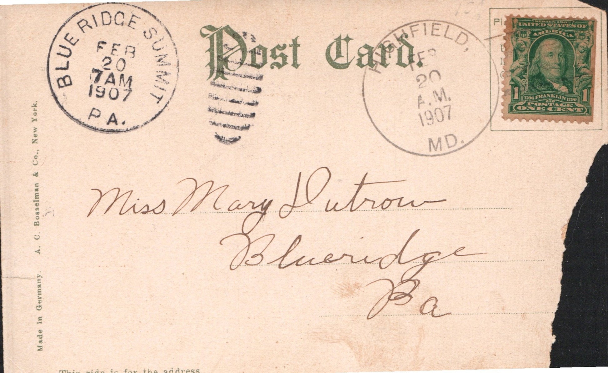 Blue Ridge Summit 1907 duplex as rec’d on post card, damaged with chunk missing lower right; 1908 4-bar on post card; 1919 duplex on Postal Card